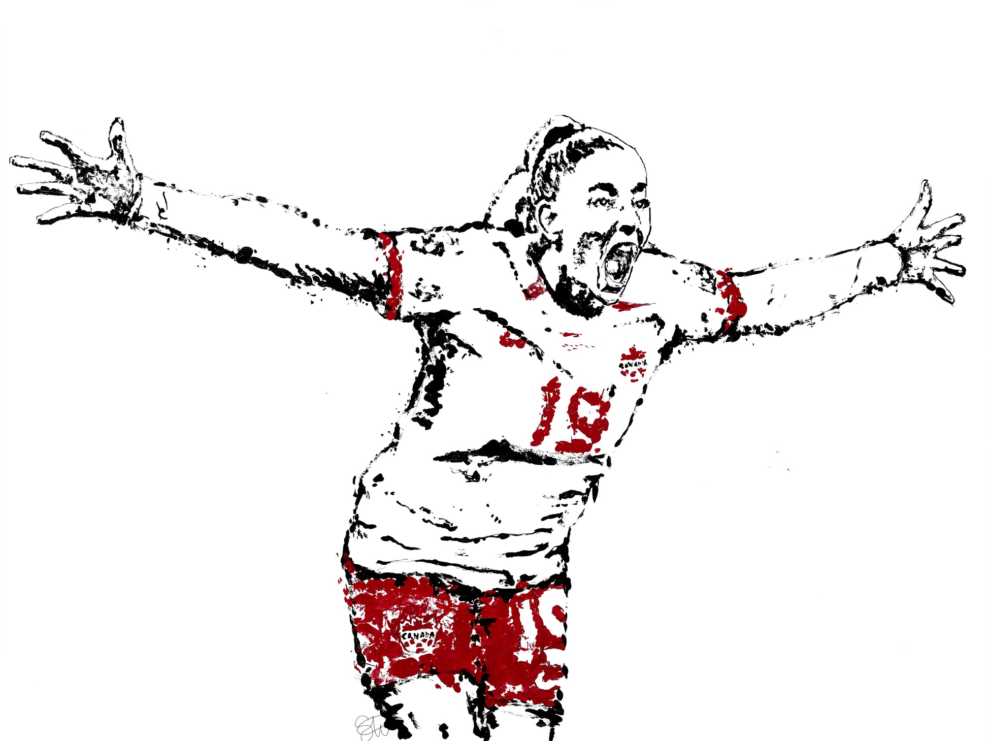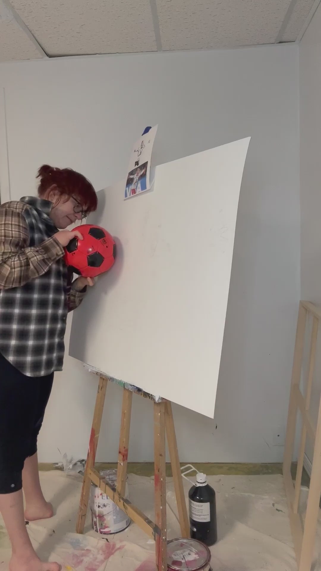 - 24" x 36". Peinture acrylique sur carton, juillet 2023. Peinture réalisée avec un ballon de soccer et une chaussure en guise de pinceau. Un pinceau a été utilisé pour mieux définir les marques faites par l'équipement de soccer.