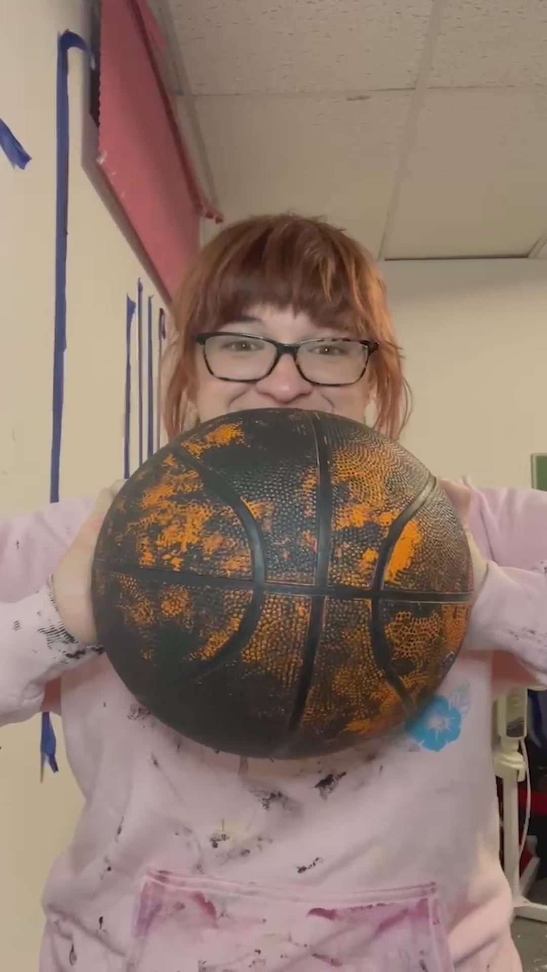 - 24" x 36". Painting made on Canson Canva paper with a basketball as a paintbrush, 2022. A paintbrush was used to further the marks made by the basketball.