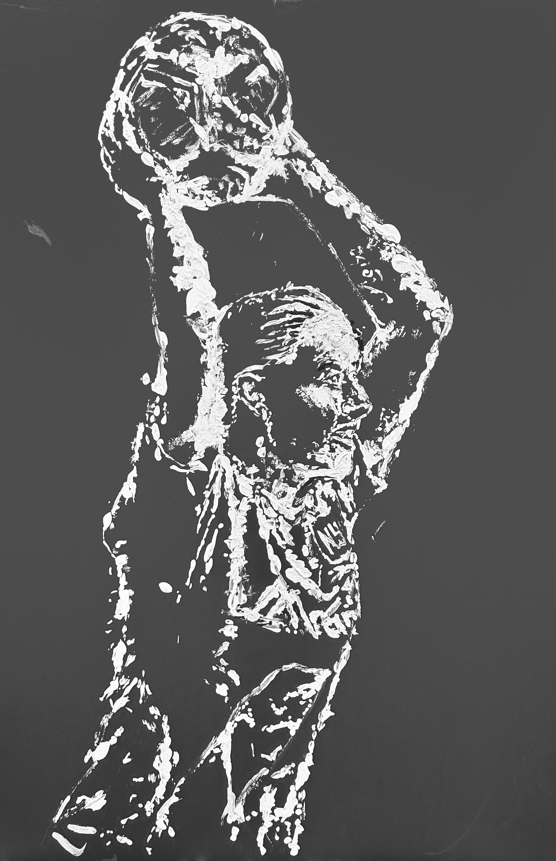 - 24" x 36". Peinture acrylique sur carton mousse, novembre 2023. Peinture réalisée avec un ballon de football et une chaussure en guise de pinceau. Un pinceau a été utilisé pour mieux définir les marques faites par le ballon de football et la chaussure.
