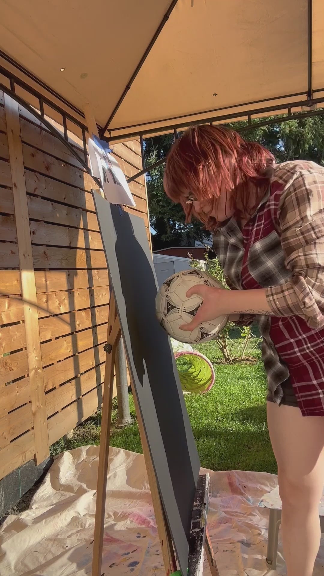 - 24" x 36". Acrylic painting on foam board, November 2023. Painting made with a football/soccer ball and shoe as a paintbrush. A paintbrush was used to further define the marks made by the football/soccer ball and shoe.
