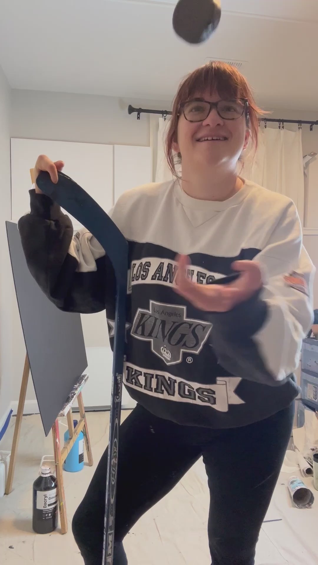 - 32" x 40". Peinture acrylique sur carton mousse, novembre 2023. Peinture réalisée avec une rondelle de hockey et un bâton de hockey en guise de pinceau. Un pinceau a été utilisé pour mieux définir les marques faites par l'équipement de hockey.