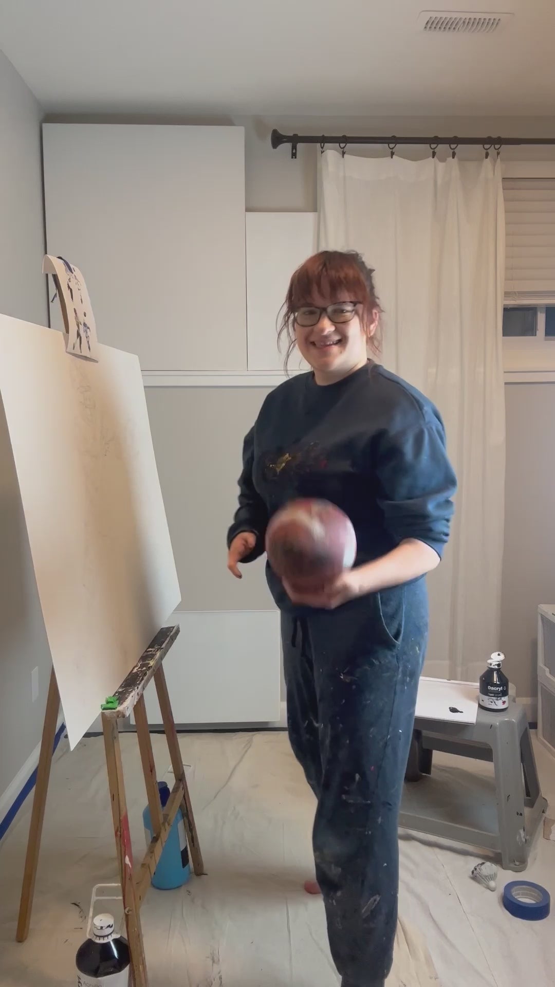 - 30" x 40". Acrylic painting on cardboard, November, 2023. Painting made with a football as a paintbrush. A paintbrush was used to further define the marks made by the football.