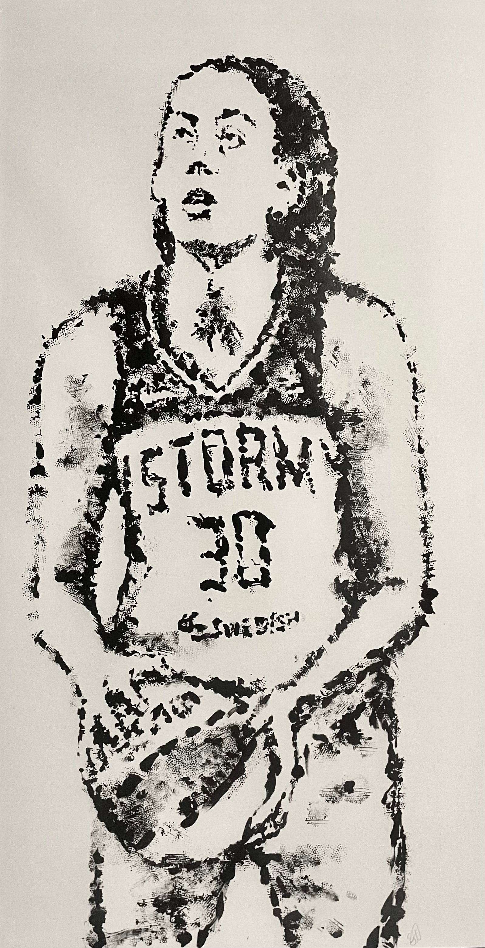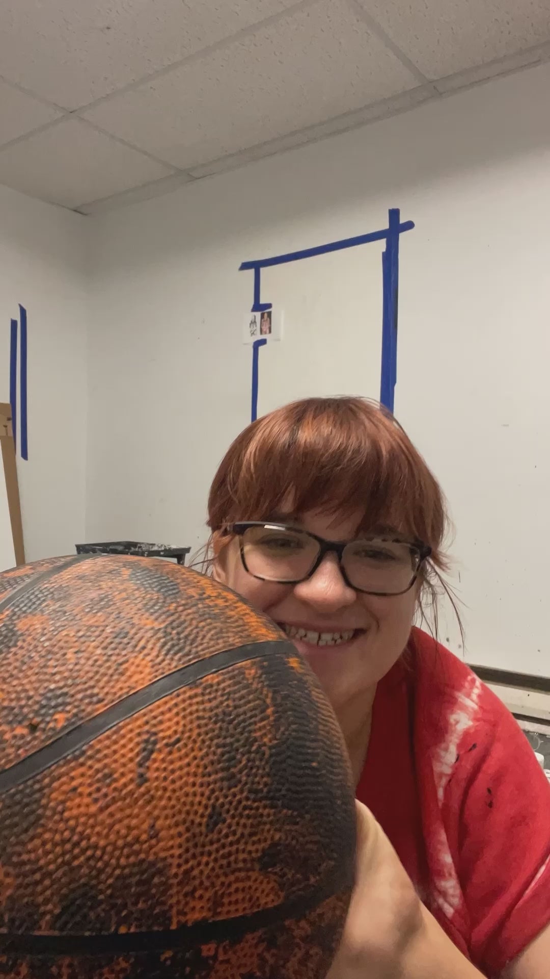 24" x 48". Painting made on Canson Canva paper with a basketball as a paintbrush, 2022. A paintbrush was used to further the marks made by the basketball.