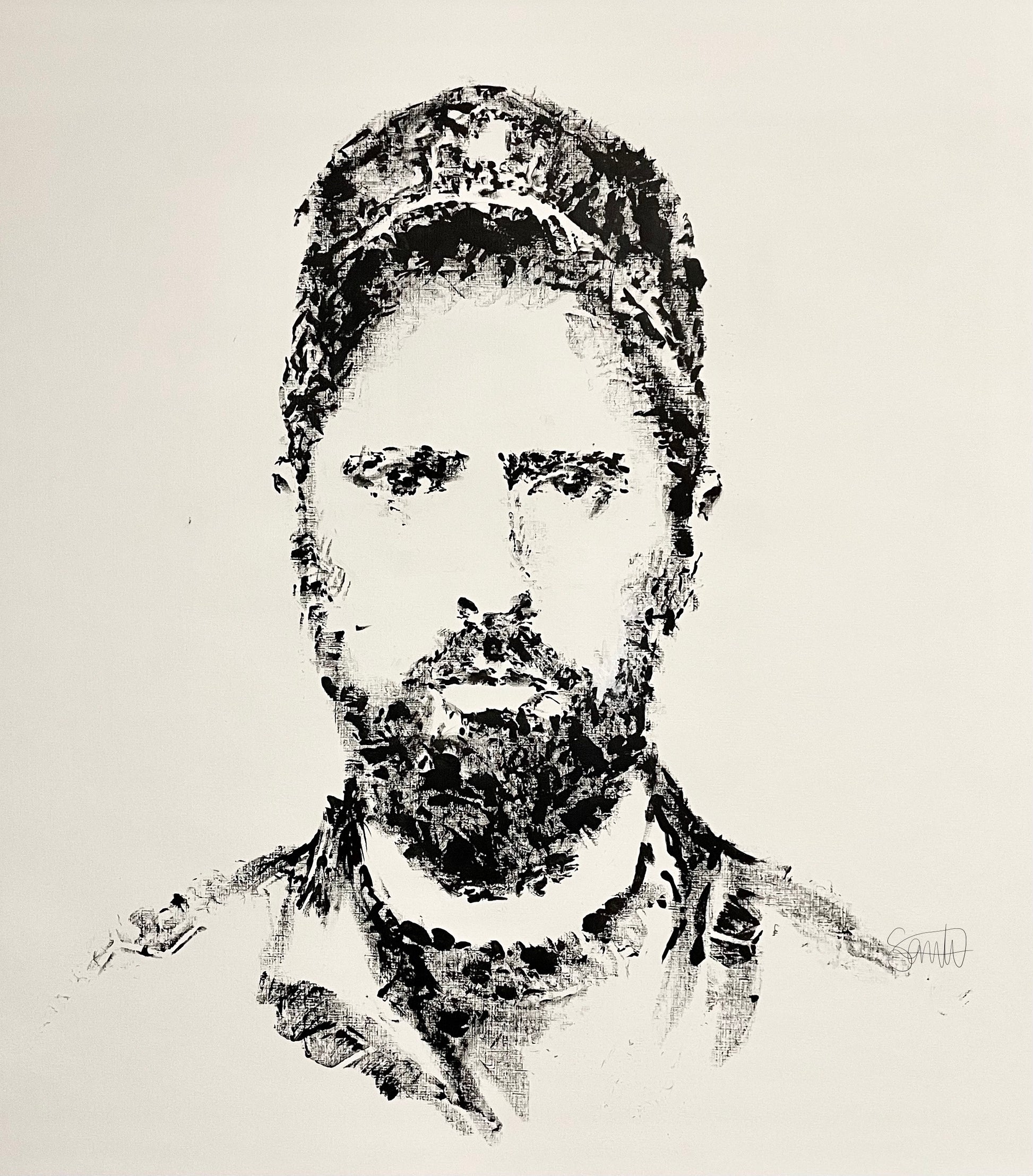 - 38" x 36", peinture acrylique sur papier Canson Canva, 2021. Peinture réalisée avec un ballon de football en guise de pinceau. Un pinceau a été utilisé pour définir davantage les marques faites avec un ballon de football.