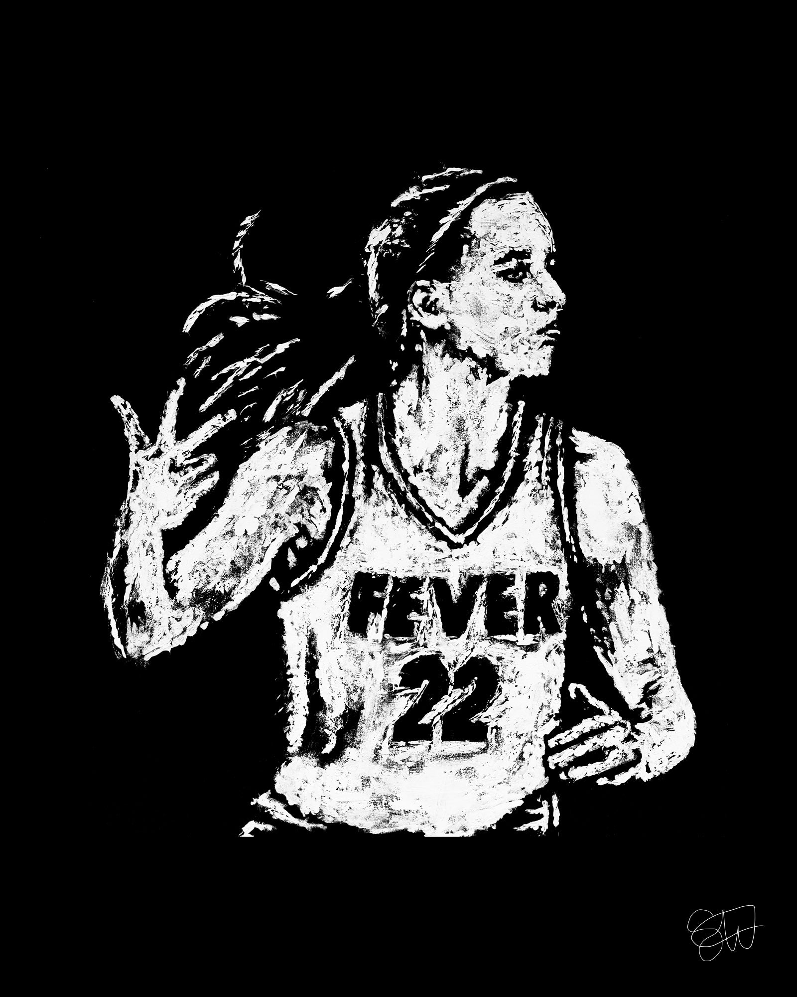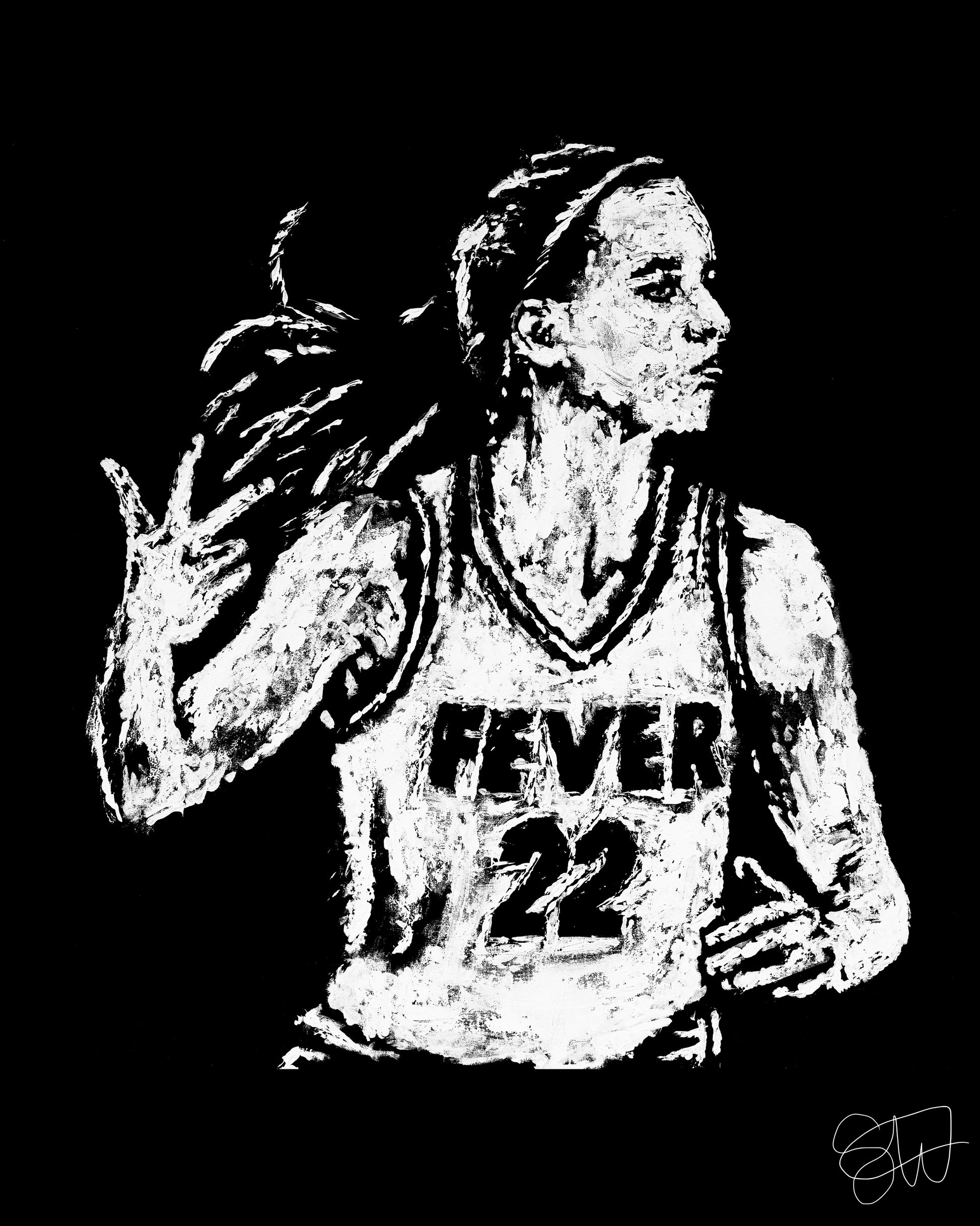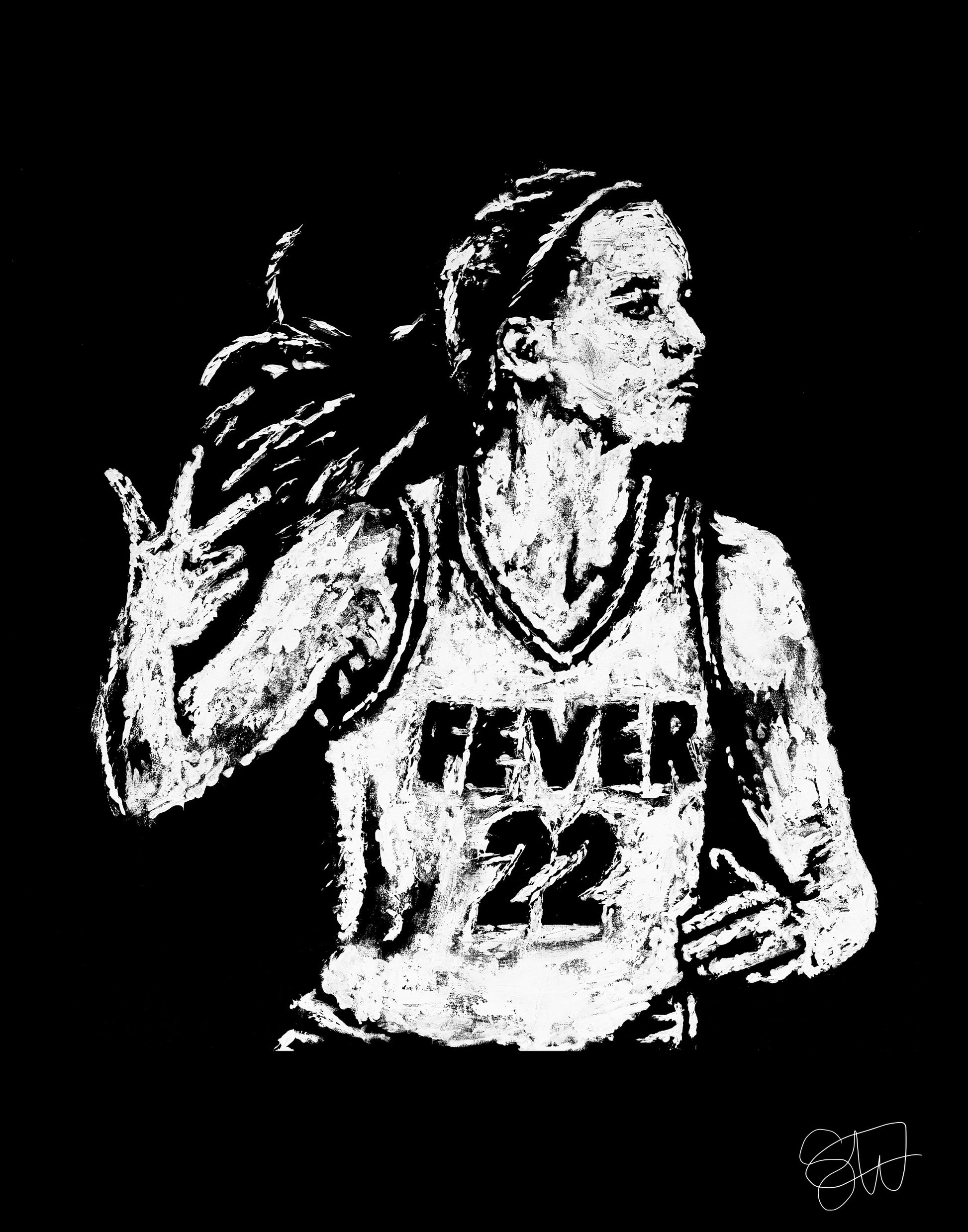 Fine Art Digital Pigment Print of painting Caitline Clark ROY with a basketball as a paintbrush. This artwork was made in collaboration with Round21 and the WNBPA. The original painting was made using a basketball as a paintbrush