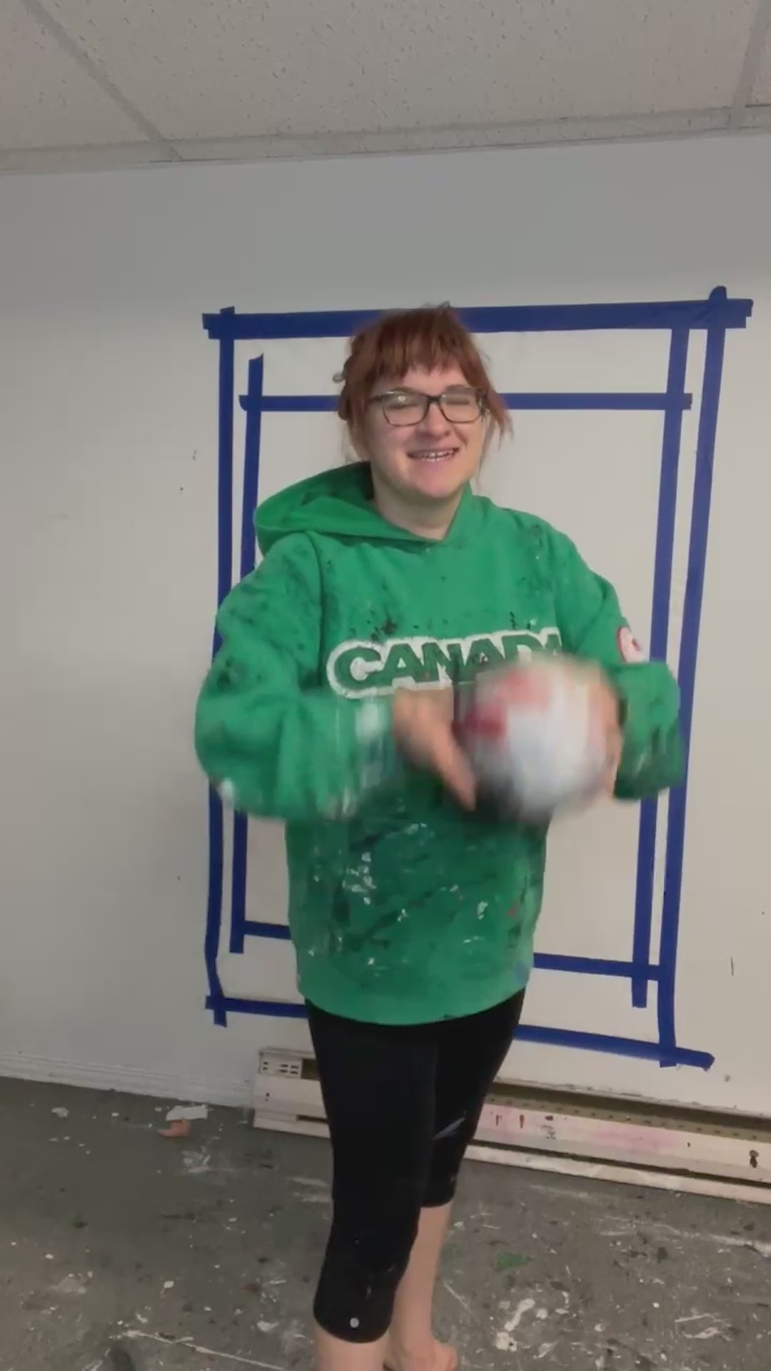 - 36" x 48", acrylic paint on Canvas. Painted using a rugby ball as a paintbrush. A paintbrush was used to further define the marks made by the rugby ball