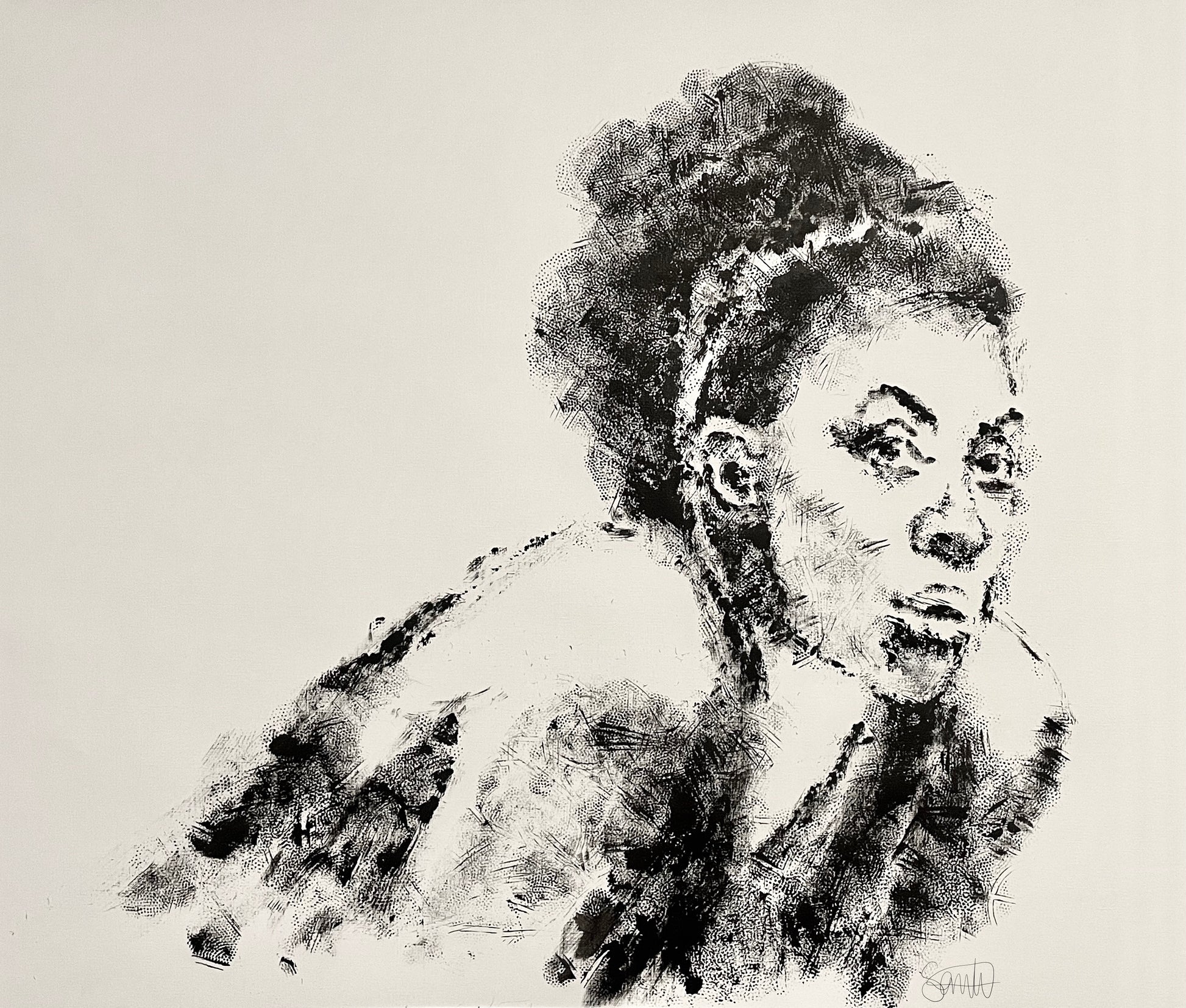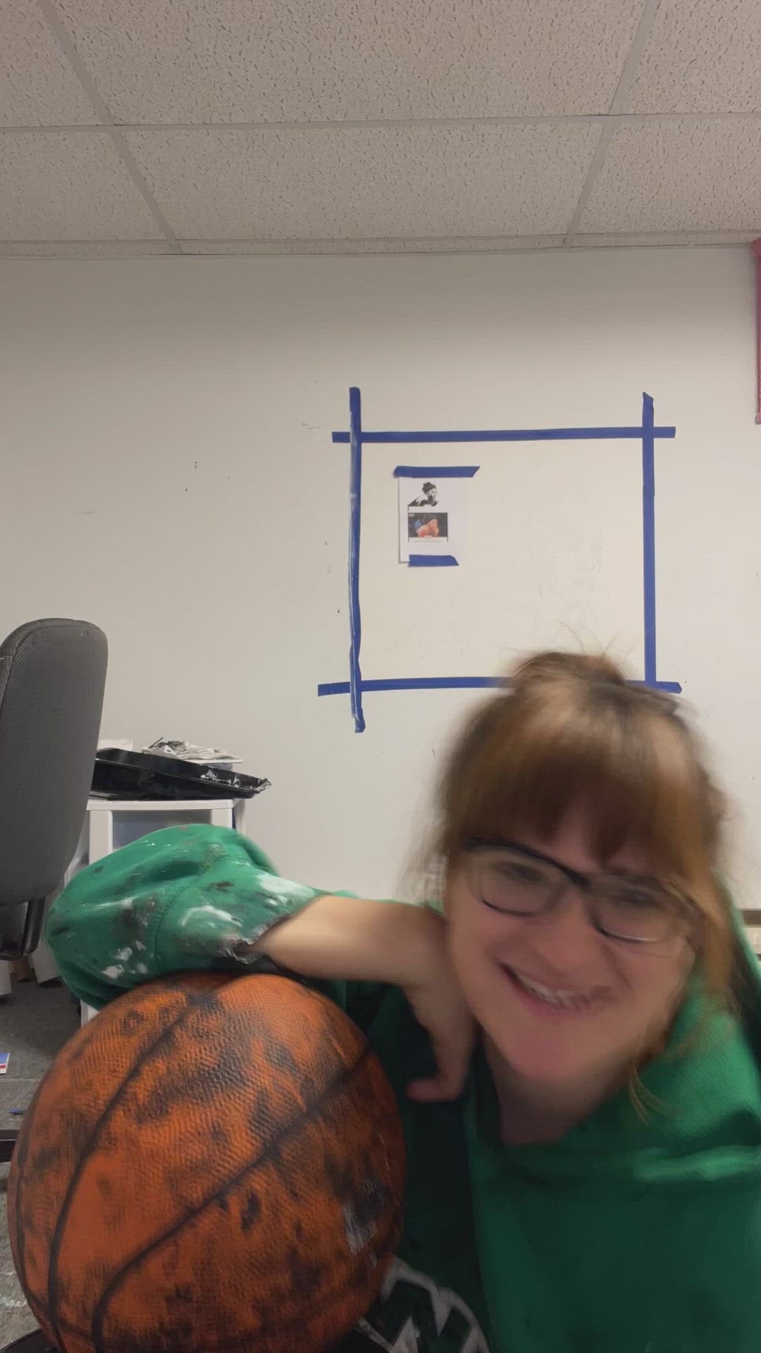 - 36" x 30", acrylic paint on Canson Canva paper. Painting of Candace Parker with a basketball as a paintbrush. A paintbrush was used to further the marks made by the basketball.