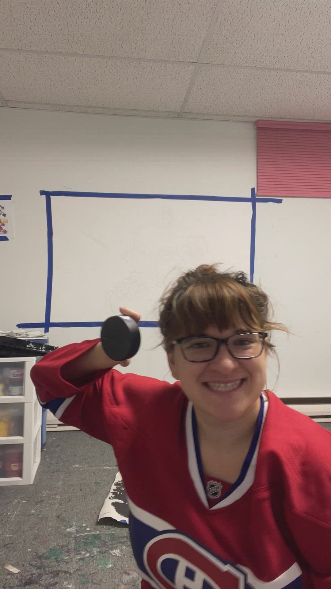 35" x 54", acrylic paint on Fabriano paper. Painting Carey Price with a hockey puck as a paintbrush. A paintbrush was used to further define the marks made by the catcher's glove.