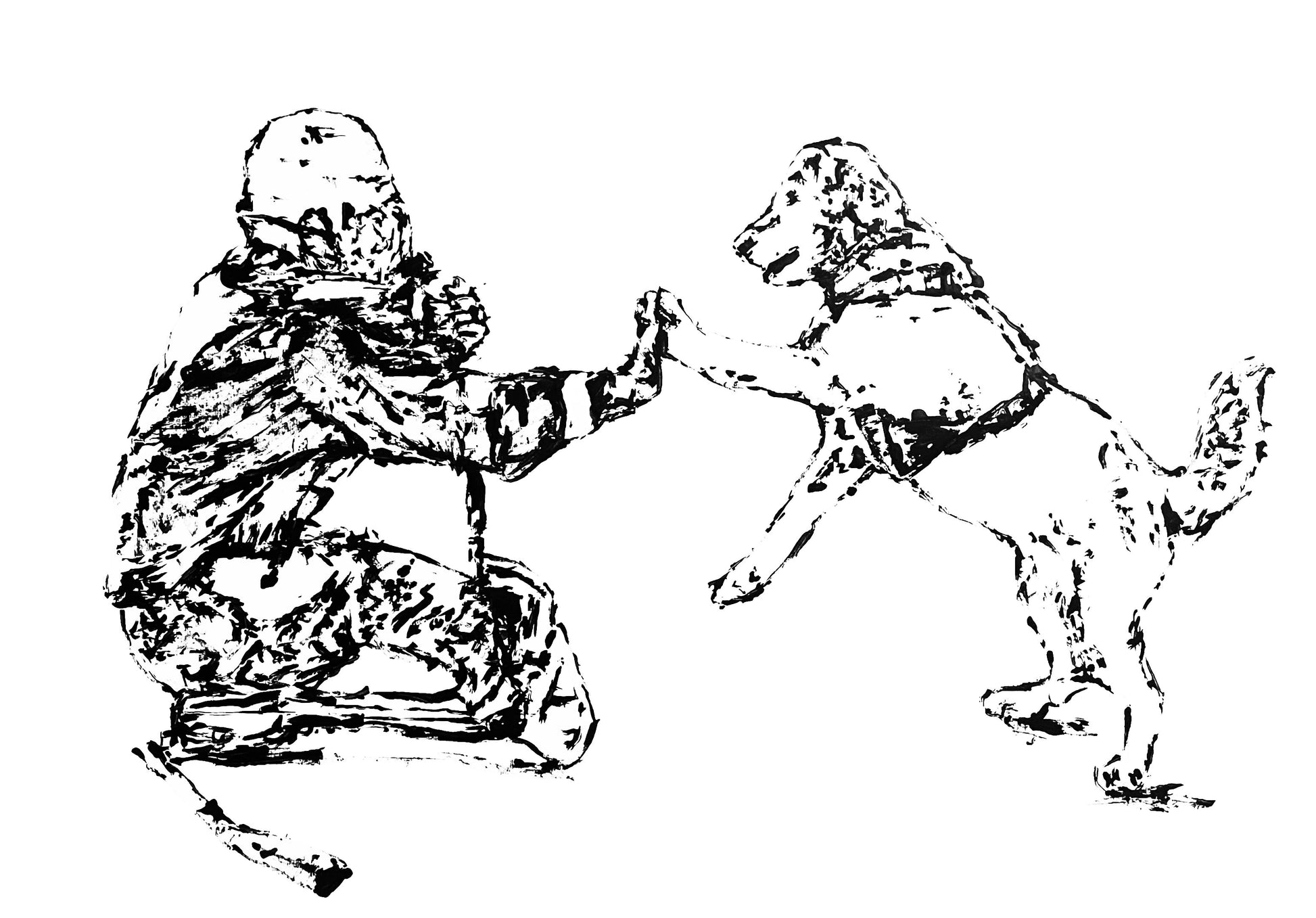Print of painting Christina Gardner and Moxie with a sledge hockey stick as a paintbrush.