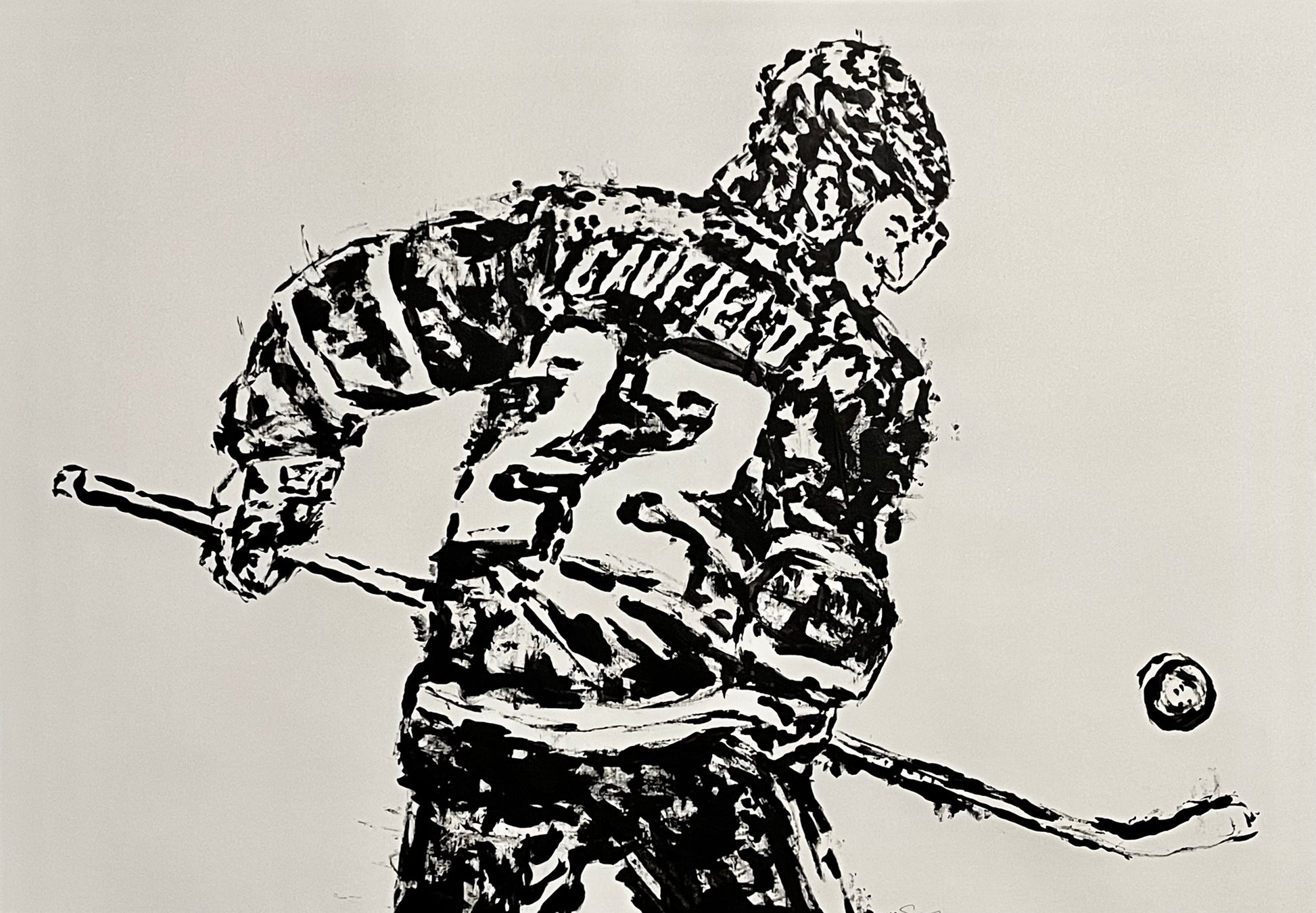 - 24" x 36". Peinture réalisée sur papier Canson Canva avec un bâton de hockey et un palet de hockey en guise de pinceau, 2022. Un pinceau a été utilisé pour définir davantage les marques faites par le palet de hockey et le bâton de hockey.