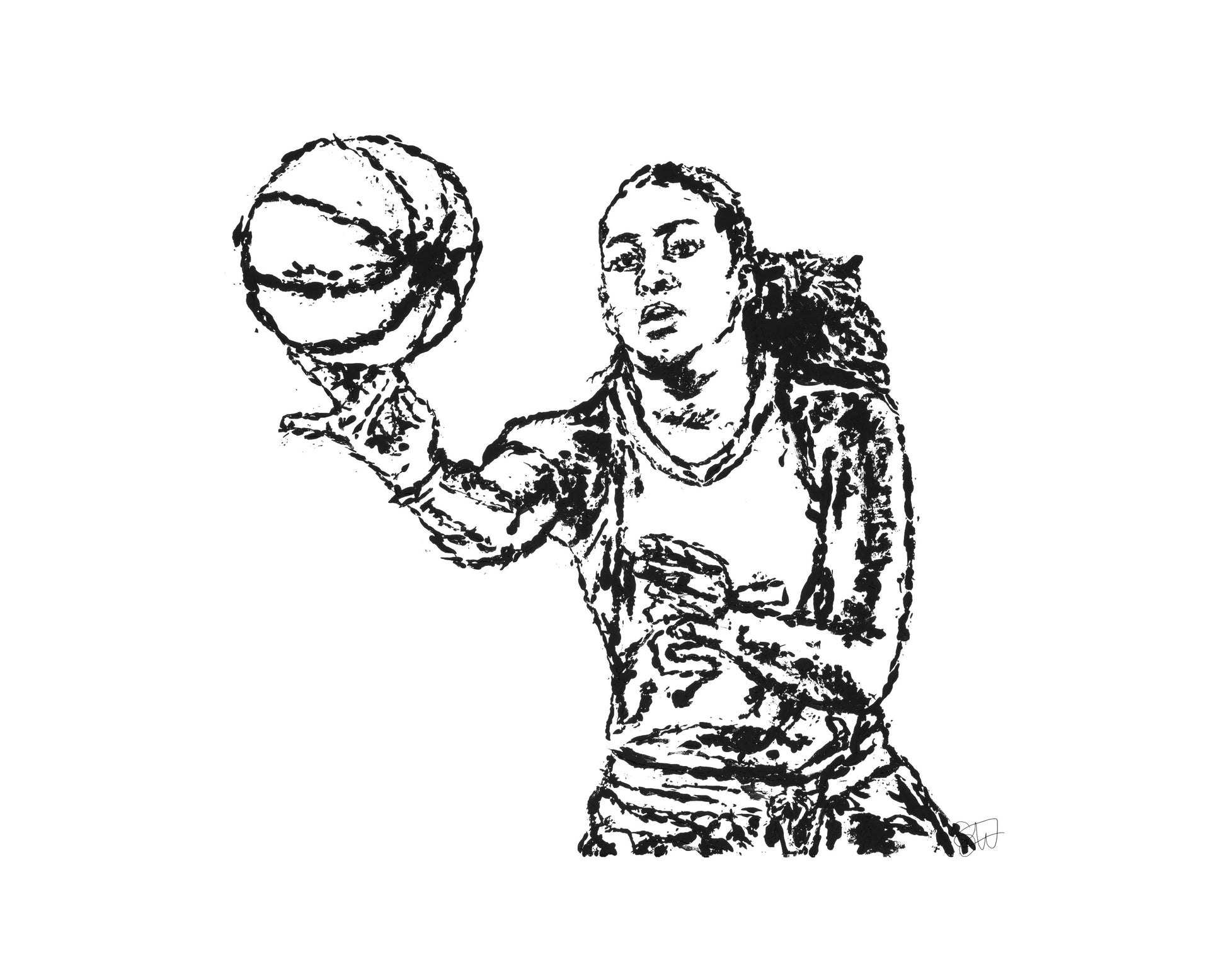 Print of painting made on canvas with a basketball as a paintbrush, 2024. A paintbrush was used to further the marks made by the basketball.
