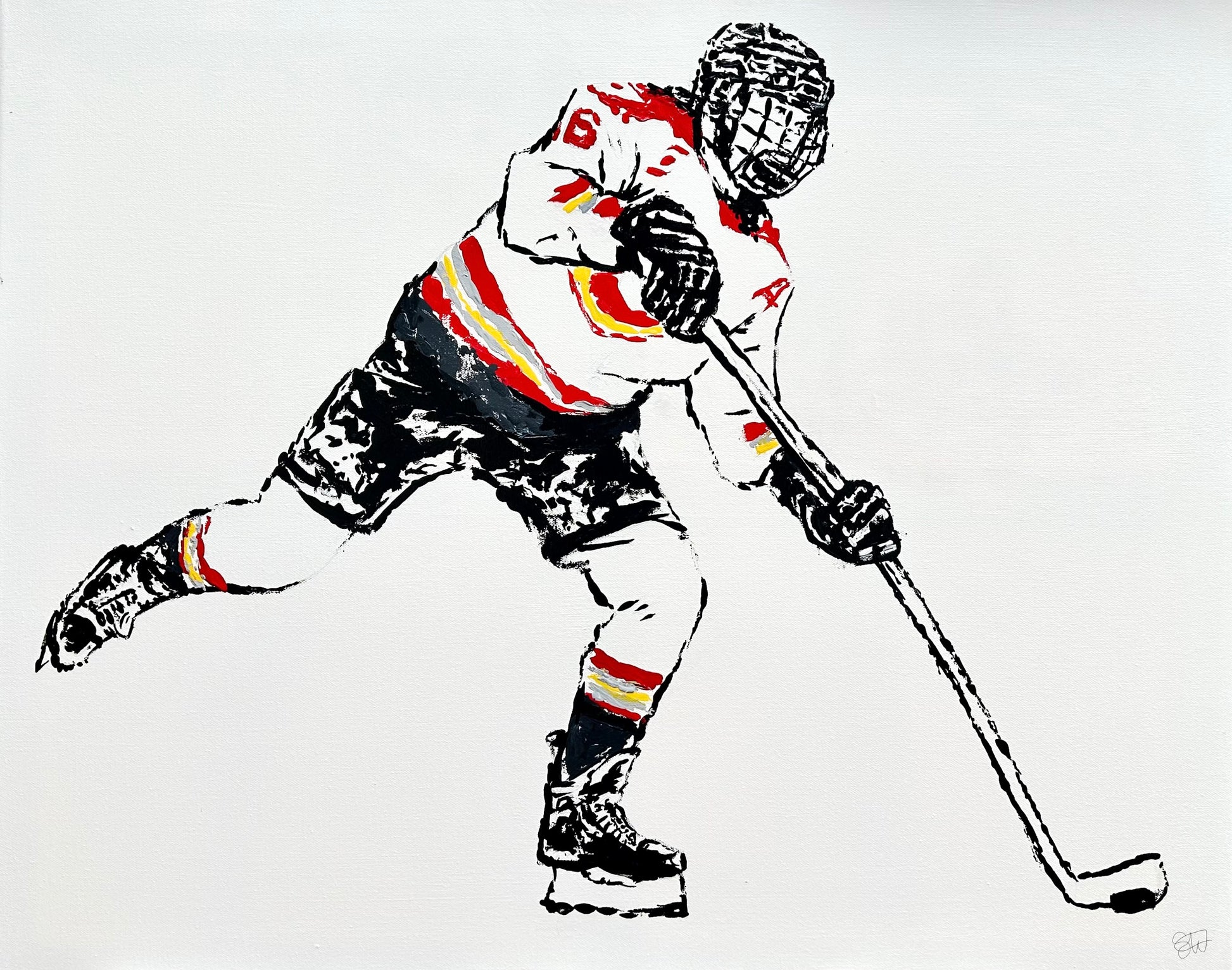 Available for purchase 24" x 30" acrylic paint on canvas. Painting made using hockey equipment as a paintbrush. A paintbrush was used to further highlight the marks made hockey equipment.