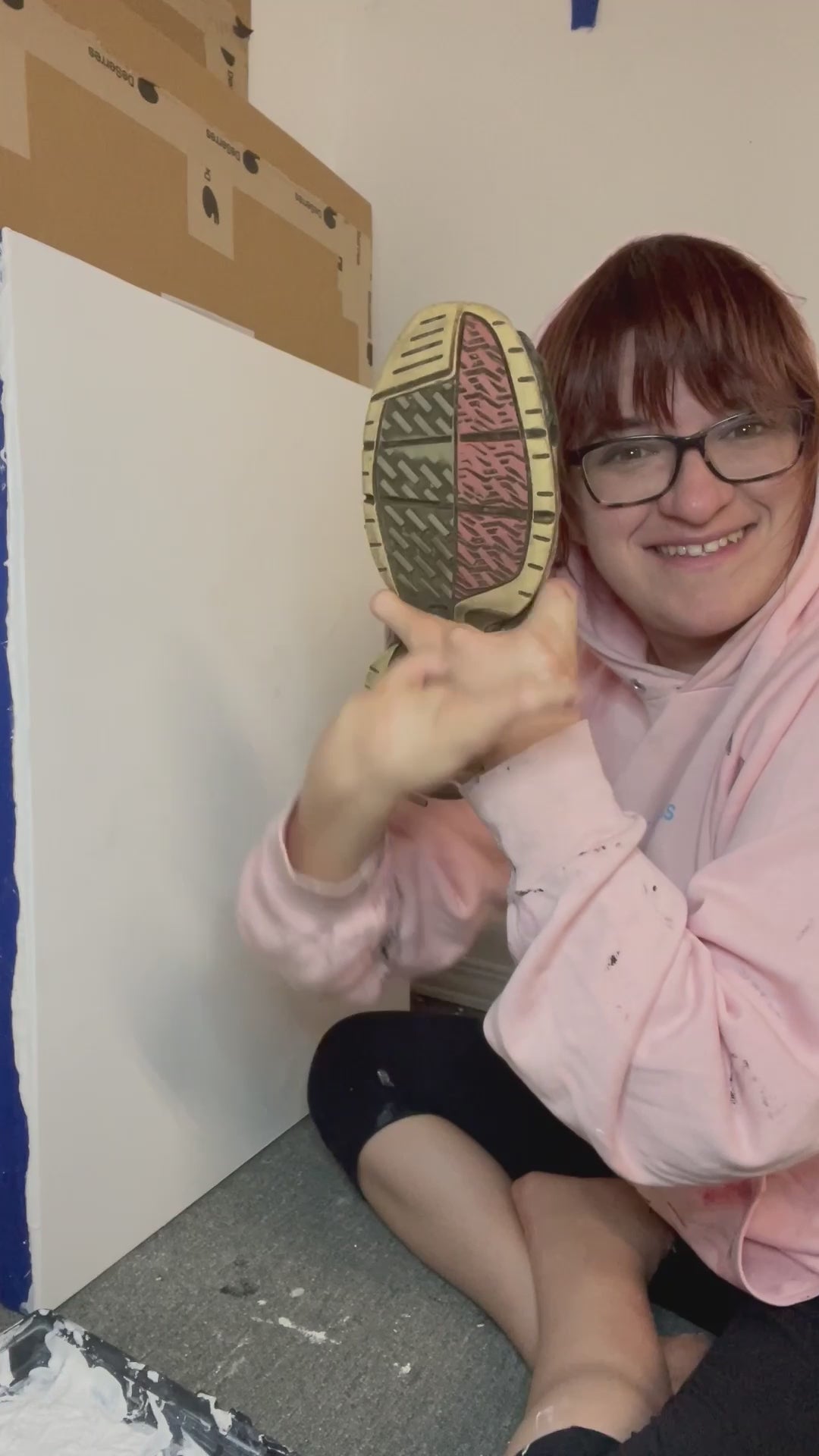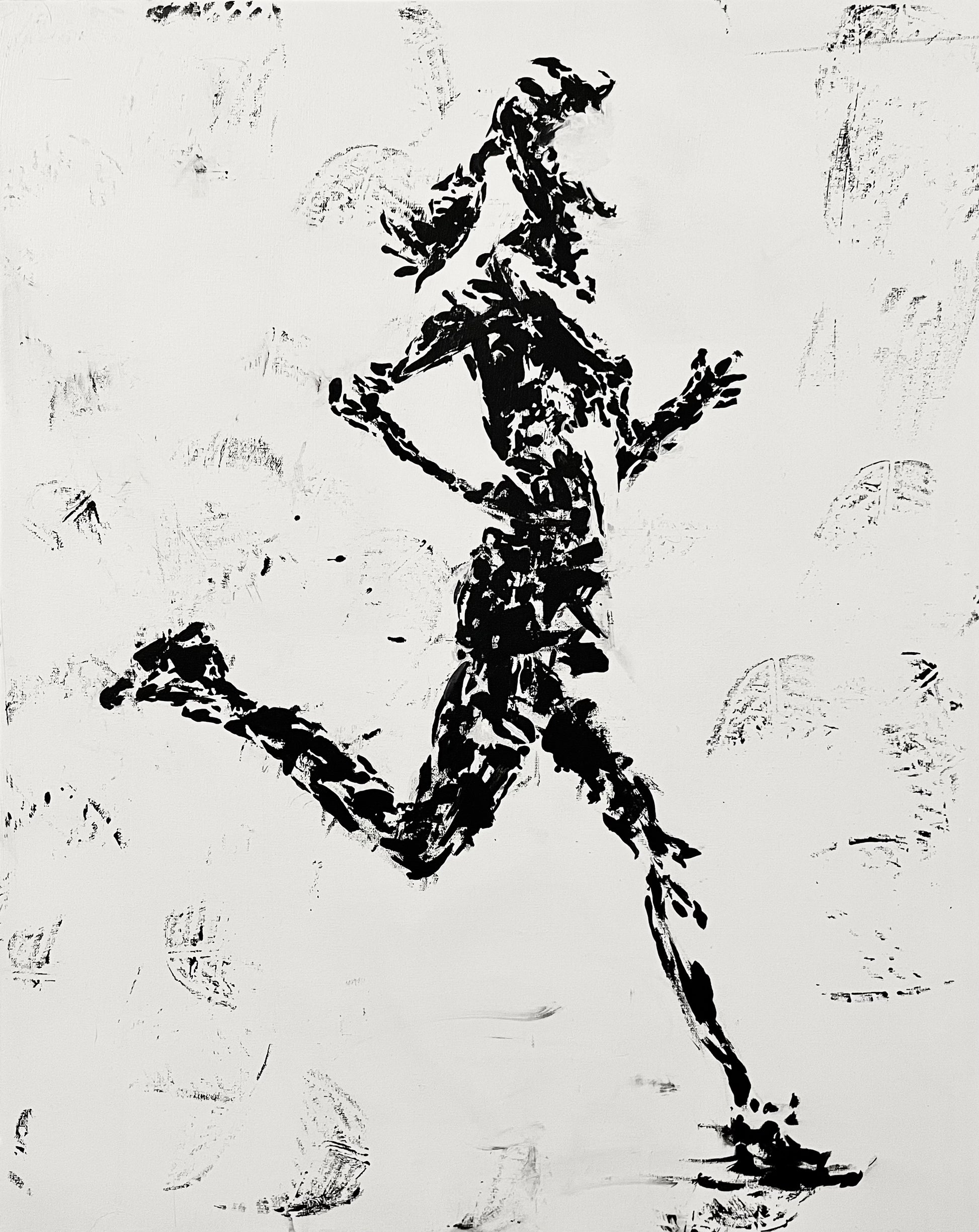 24" x 30" acrylic paint on canvas. Painted with a running shoe as a paintbrush. A paintbrush was used to further the marks made by the running shoe.