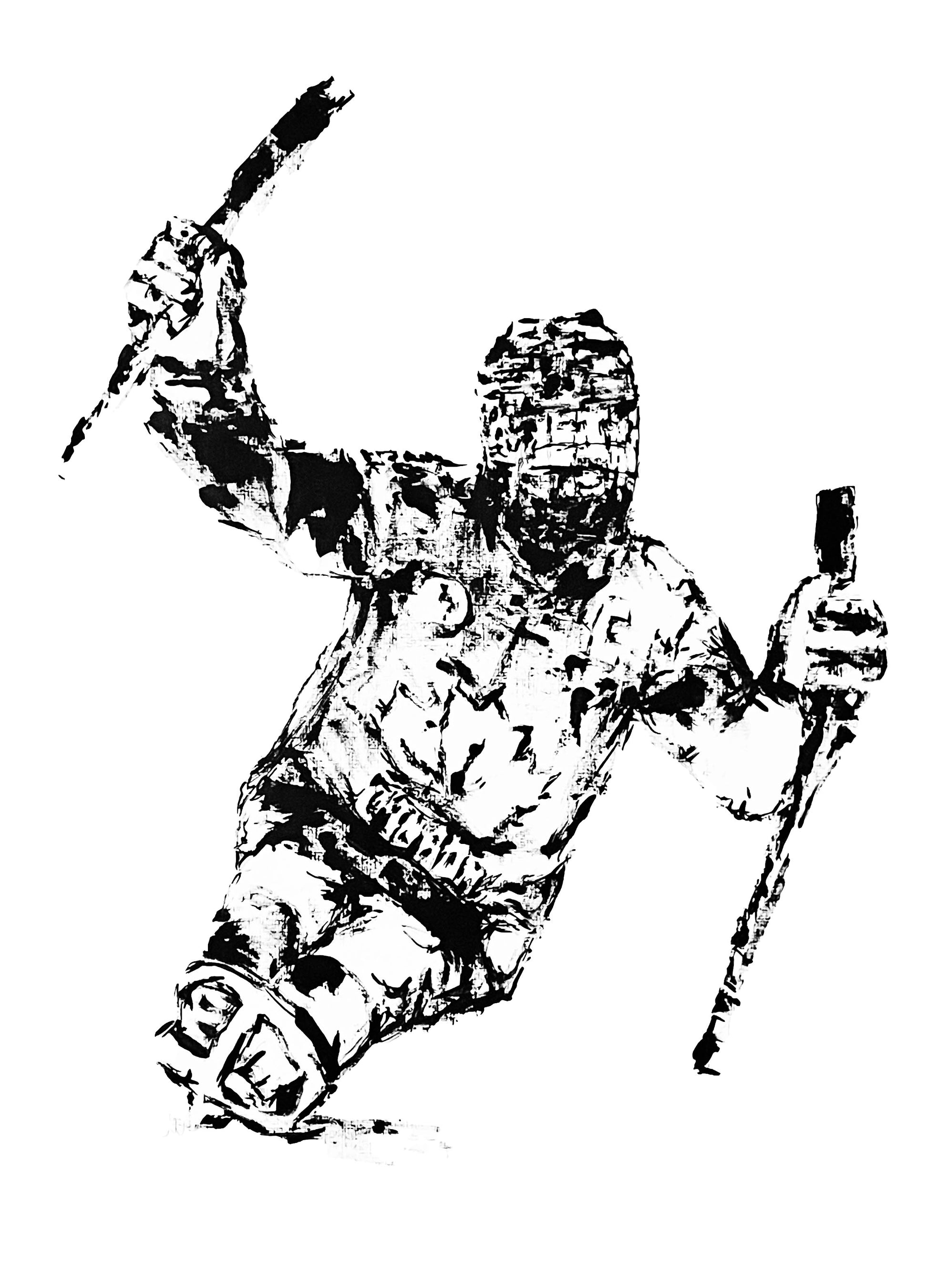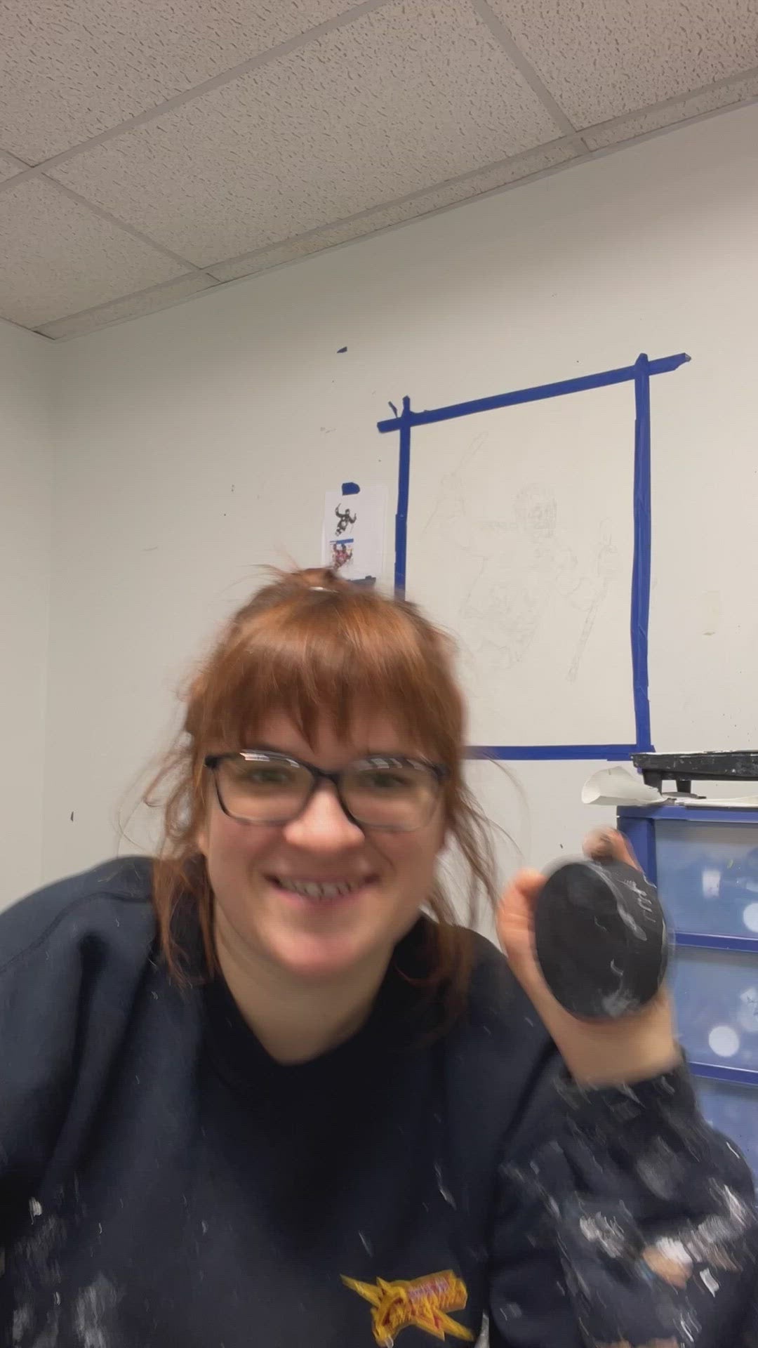 Print of painting made with a hockey puck as a paintbrush. A paintbrush was used to further define the marks made by the hockey puck