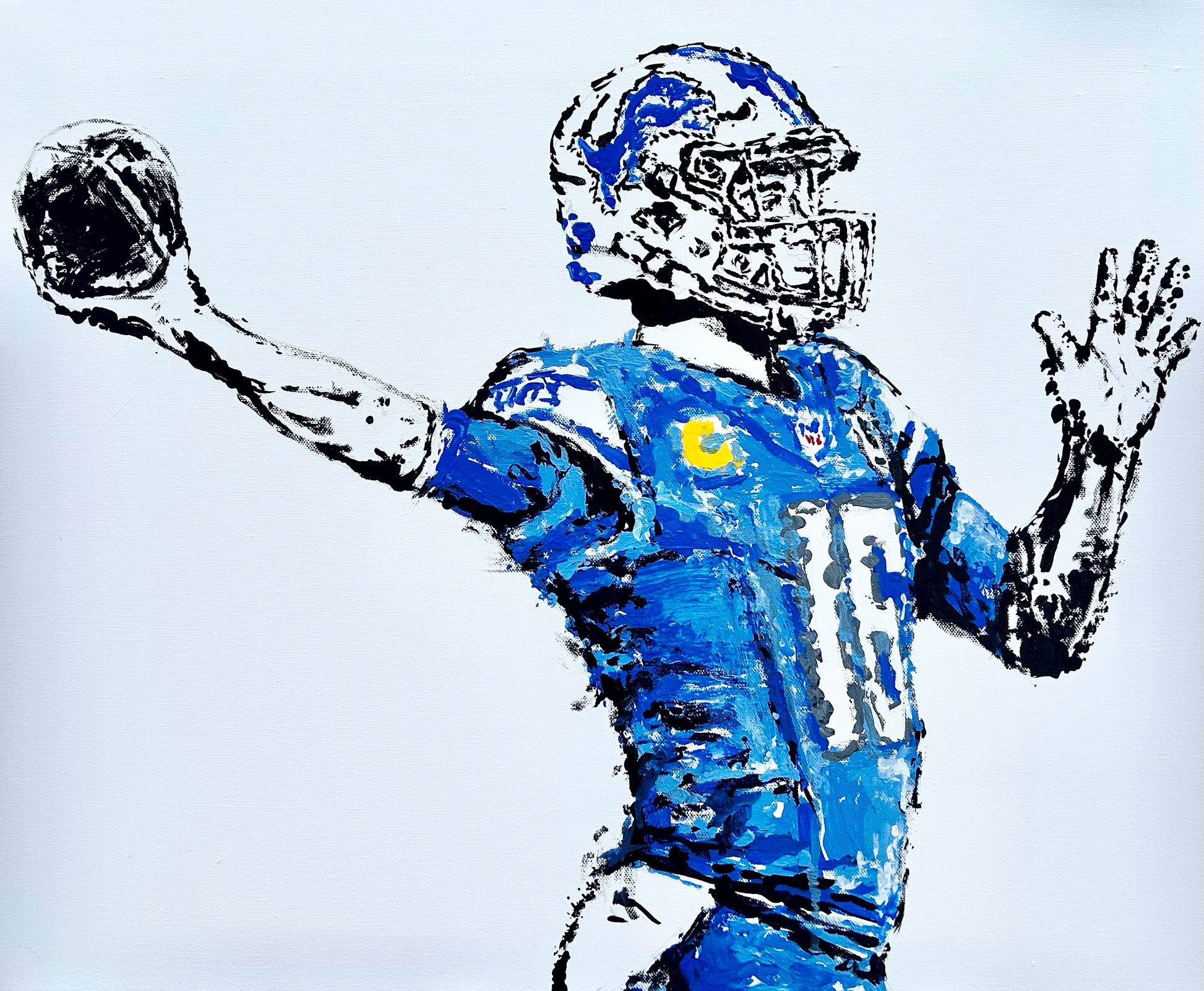 - 20" x 34". Peinture acrylique sur toile, 2024. Peinture réalisée avec un ballon de football en guise de pinceau. Un pinceau a été utilisé pour mieux définir les marques faites par le ballon de football.