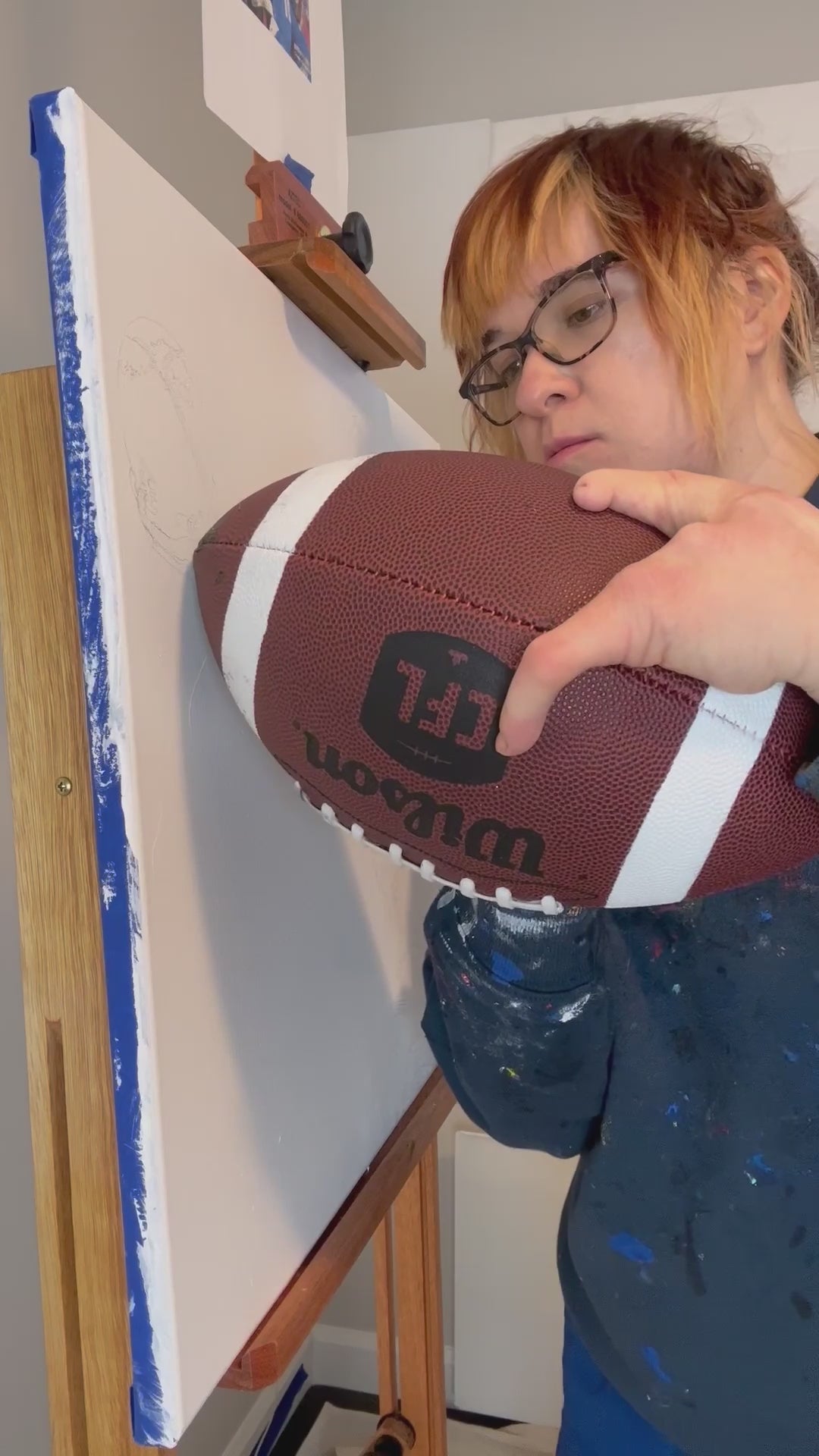 - 20" x 34". Acrylic painting on canvas, 2024. Painting made with a football as a paintbrush. A paintbrush was used to further define the marks made by the football.