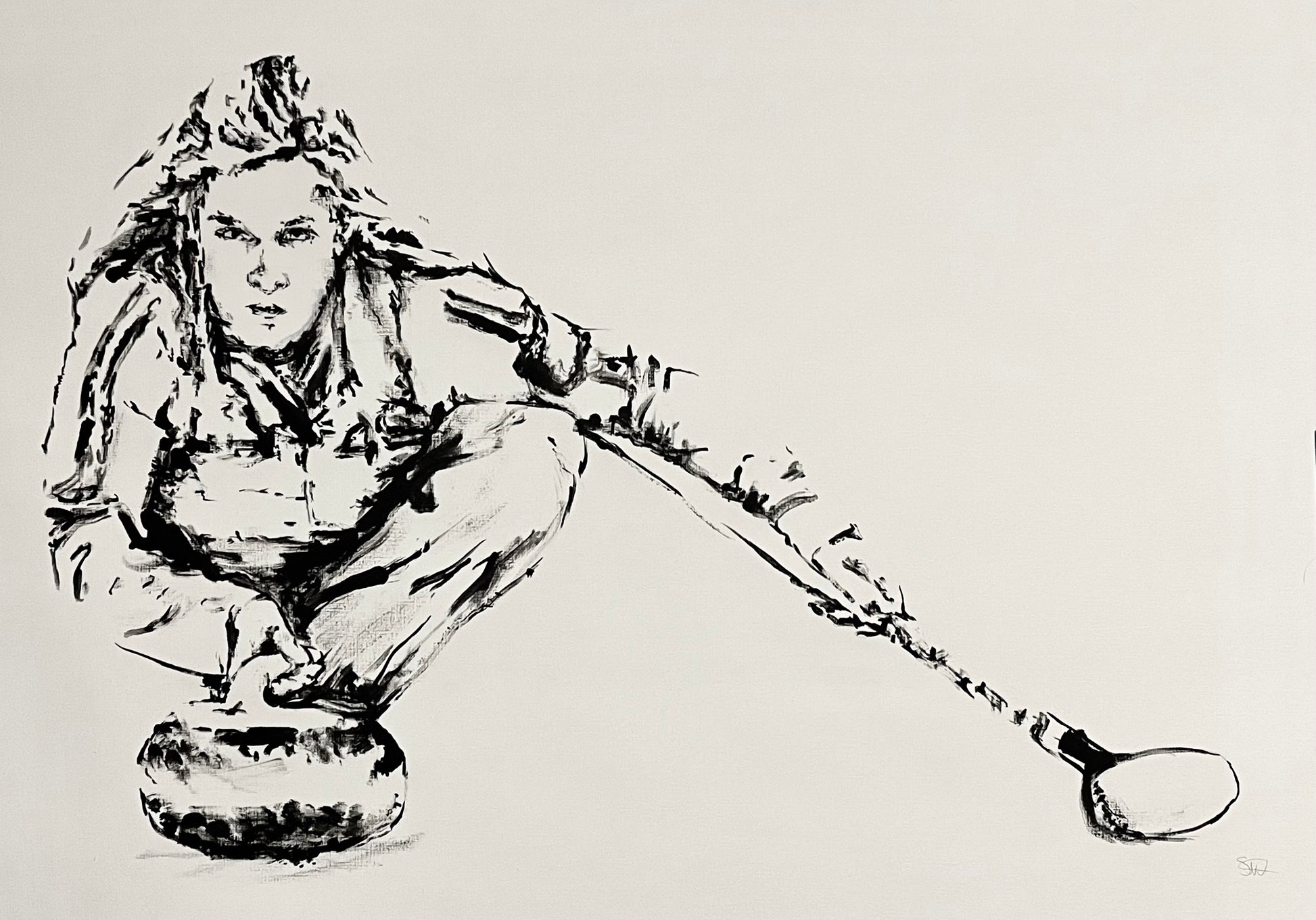 - 24" x 36", acrylic paint on Canson Canva paper, 2022. Painting made with a curling broom as a paintbrush. A paintbrush was use to further define the marks made by the curling broom.