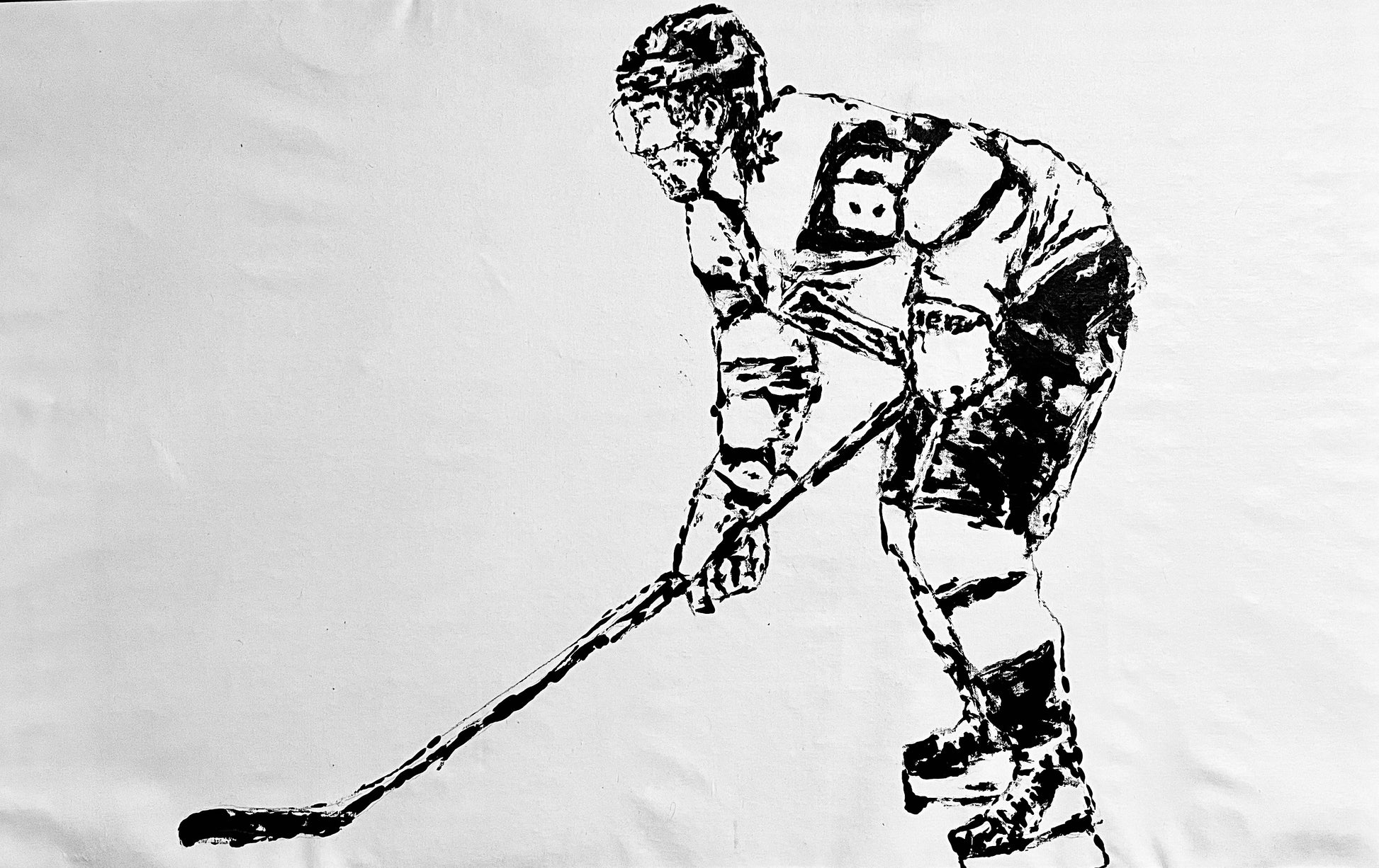 - 30" x 48". Painting made on canvas with a hockey stick as a paintbrush, June 2nd, 2023. A paintbrush was used to further the marks made by the hockey equipment.