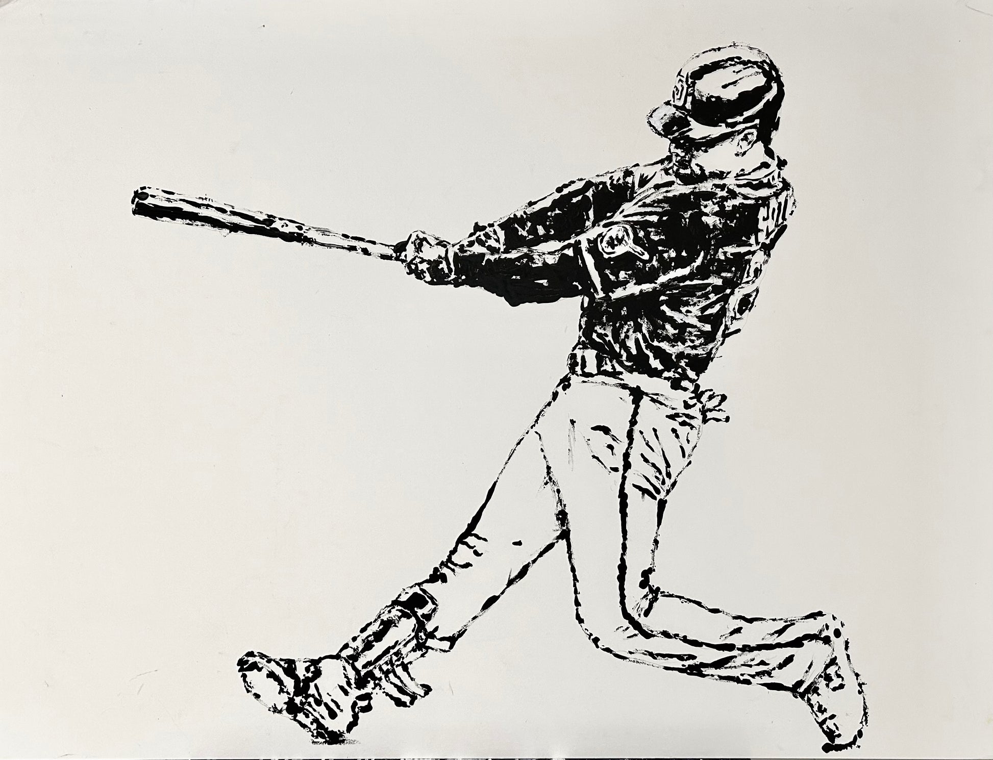 - 30" x 40". Acrylic painting on cardboard, July, 2023. Painting made with a baseball and baseball bat as a paintbrush. A paintbrush was used to further define the marks made by the baseball equipment.