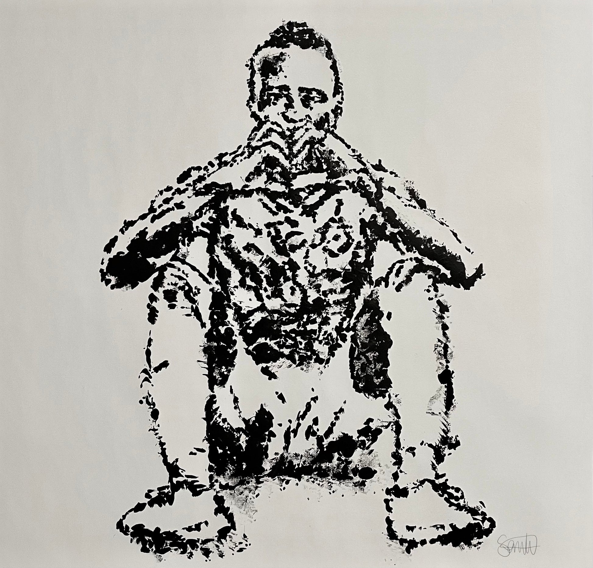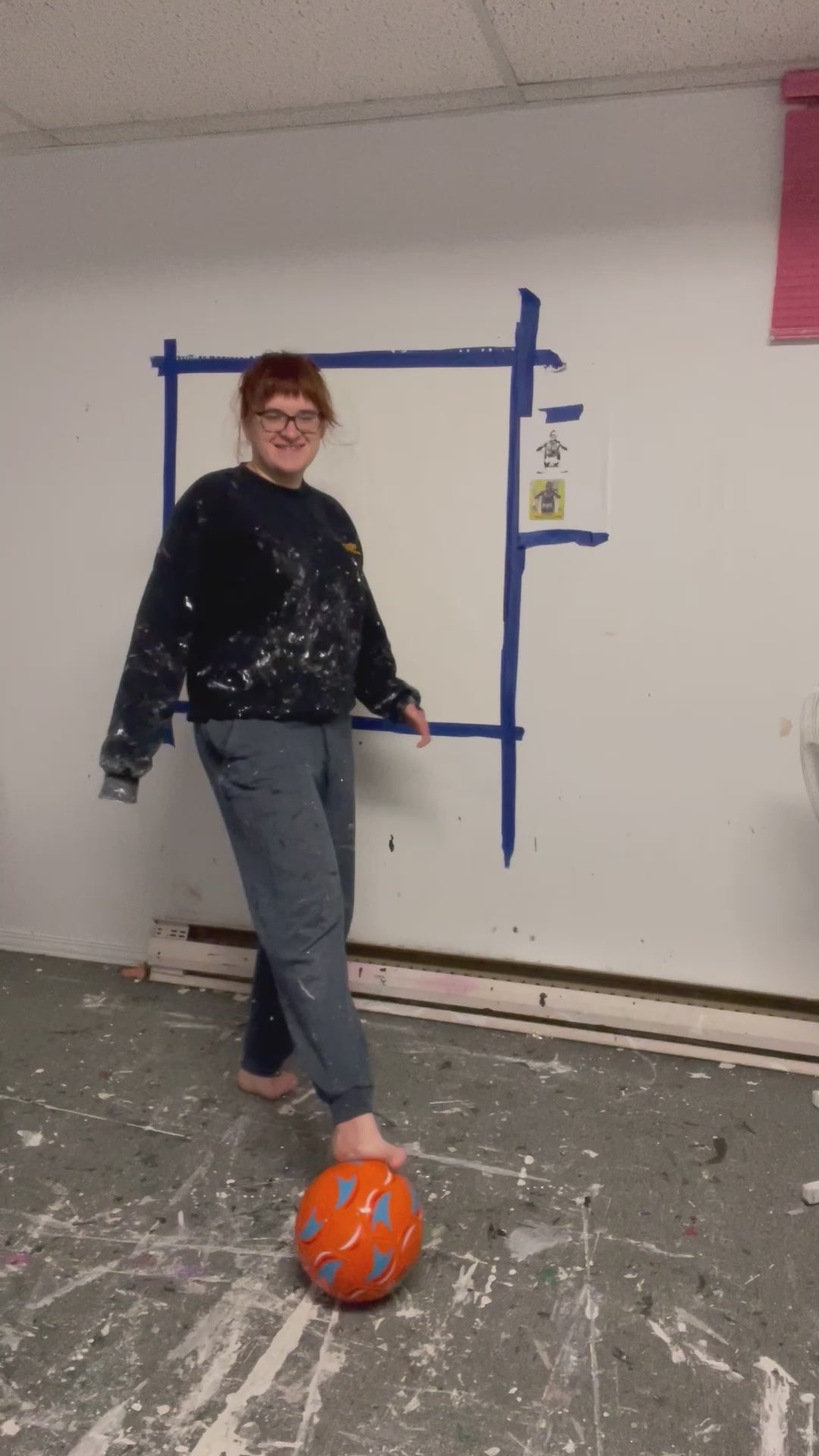 - 36" x 53", peinture acrylique sur papier Canson Canva, 2023. Peinture réalisée avec un ballon de soccer comme pinceau. Un pinceau a été utilisé pour définir davantage les marques faites par un ballon de soccer.