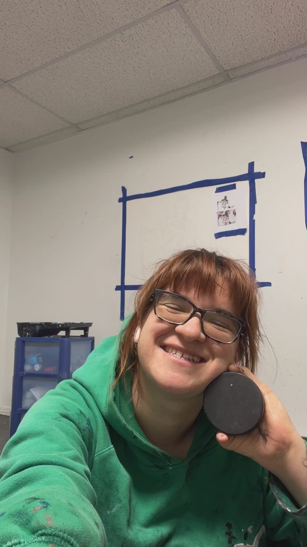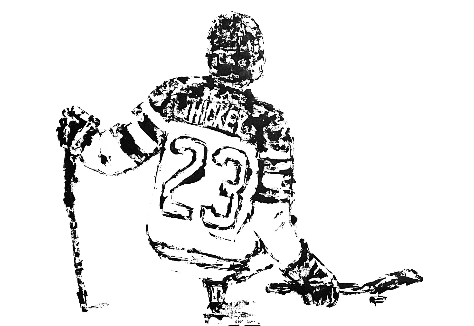 Print of painting made with a hockey puck as a paintbrush. A paintbrush was used to further define the marks made by the hockey puck