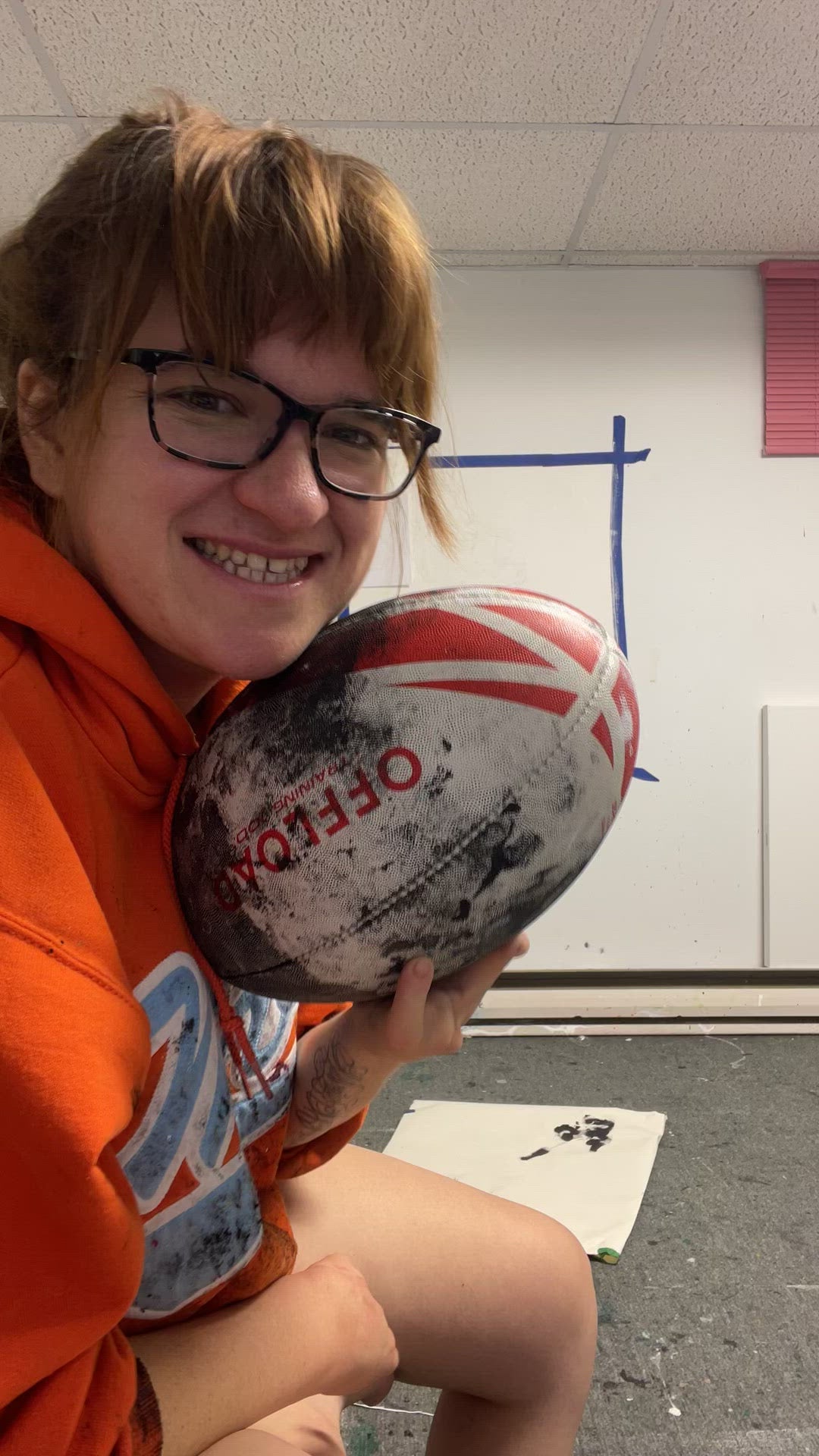 Impression de la peinture de Lucas Rumball réalisée avec un ballon de rugby.