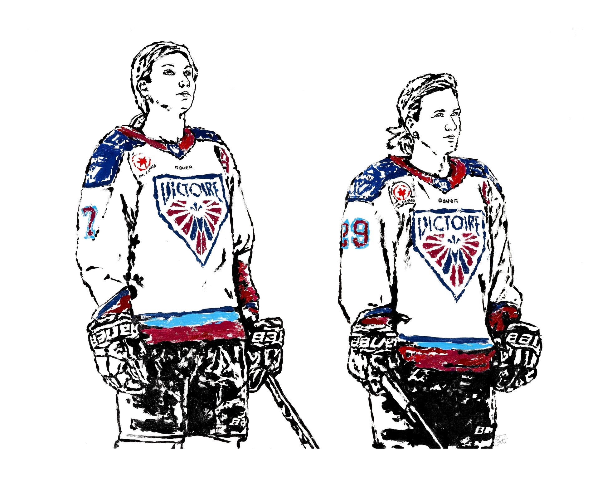 Fine Art Digital Pigment Print of painting Marie-Philip Poulin and Laura Stacey with hockey equipmet as a paintbrush.