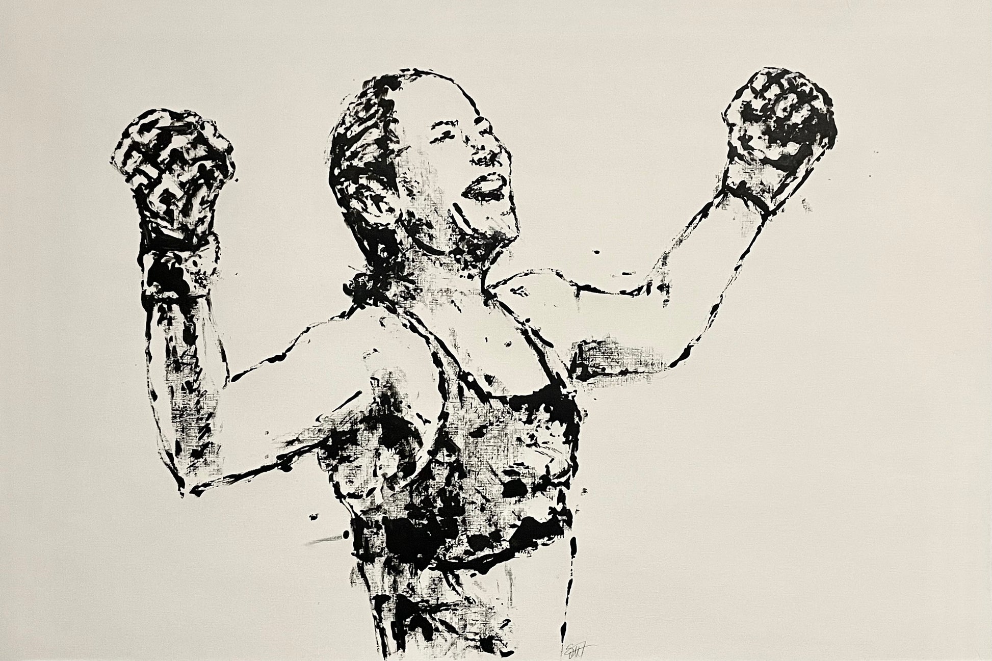 - 24" x 36", acrylic paint on Canson Canva paper, 2022. Painting made with a punching bag as a paintbrush. A paintbrush was used to further define the marks made by the punching bag
