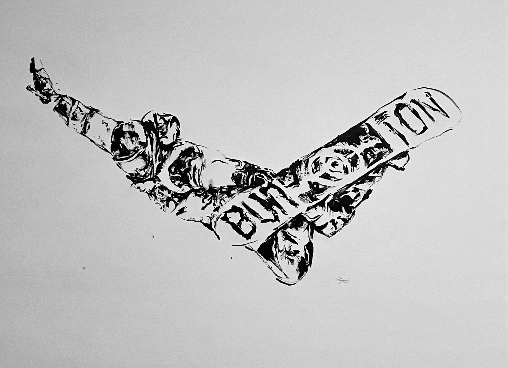 - 36" x 48", peinture acrylique sur papier Canson Canva, 2022. Peinture réalisée avec une botte de ski en guise de pinceau. Un pinceau a été utilisé pour définir davantage les marques faites par la botte de ski.