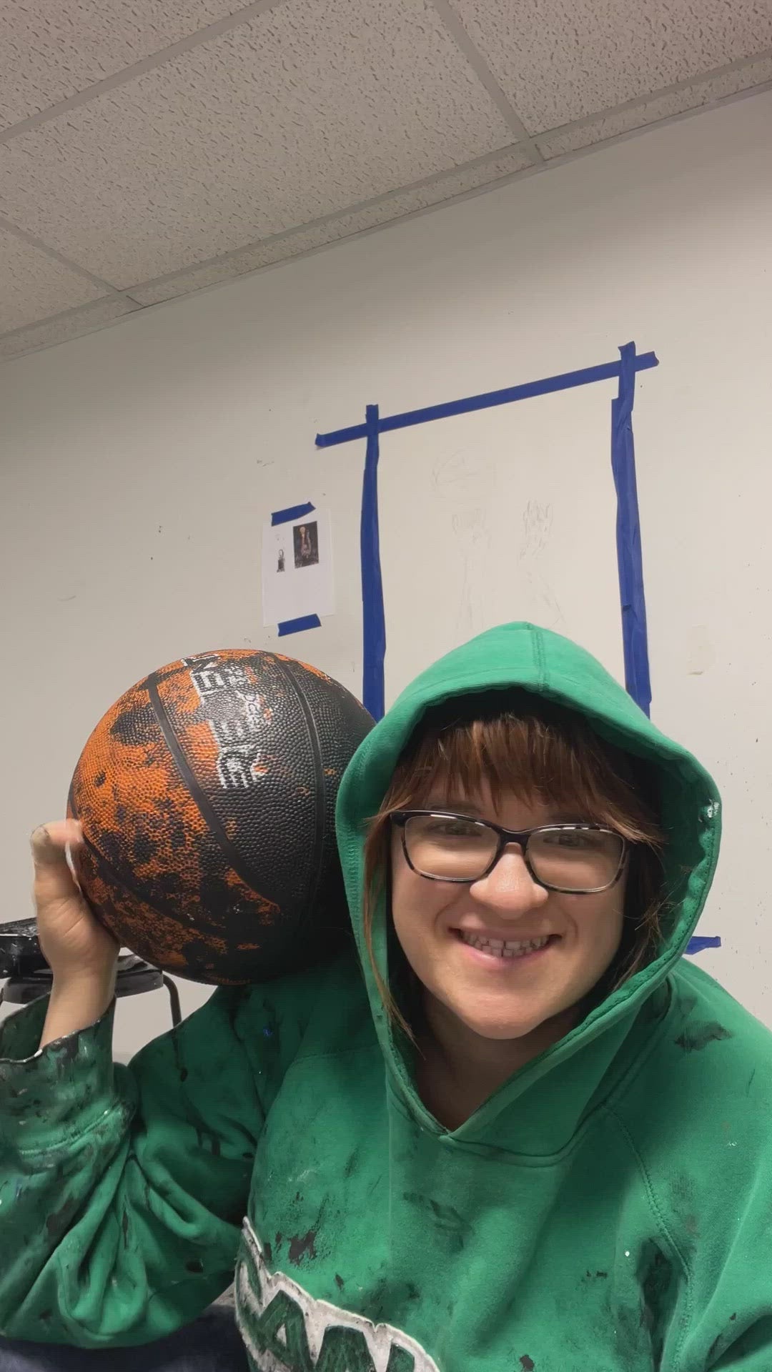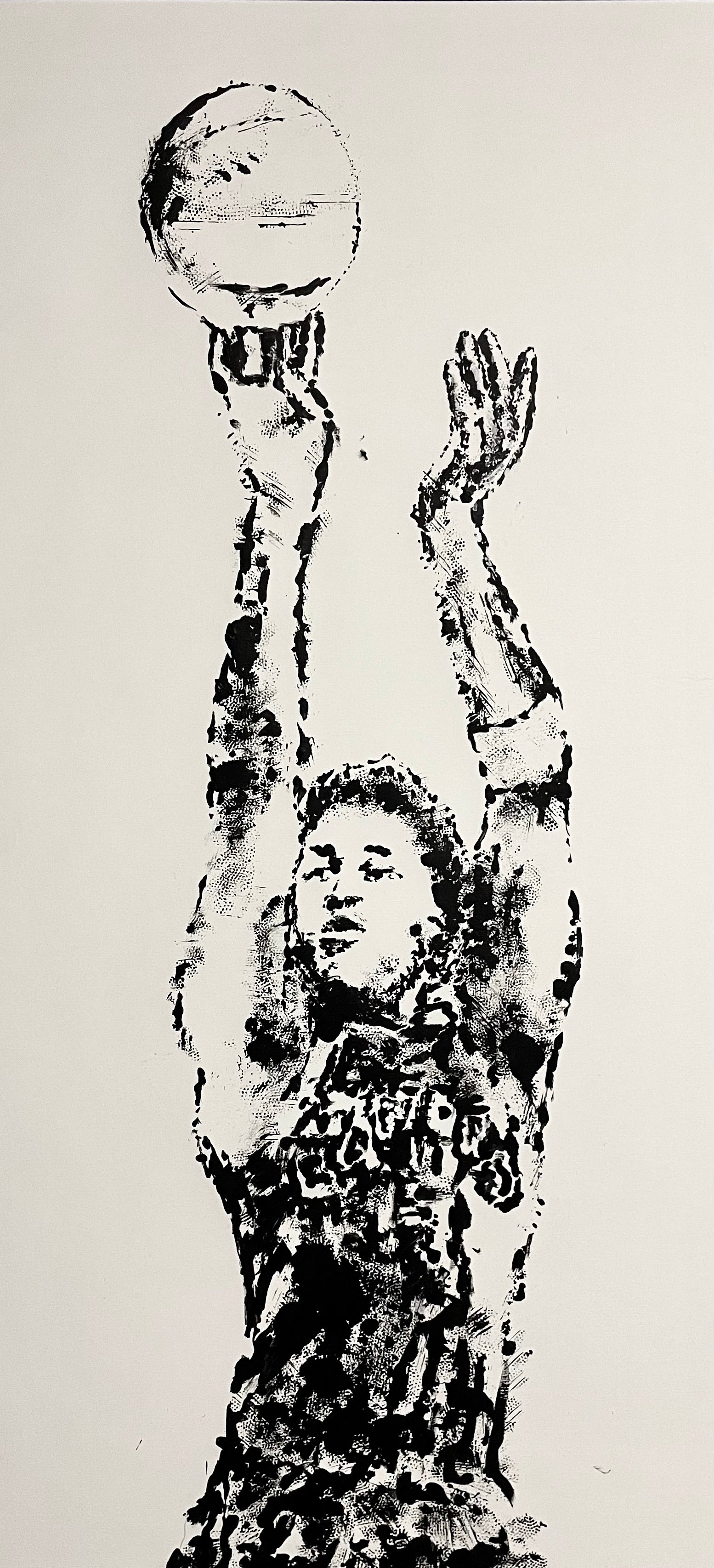- 24" x 48", acrylic paint on Canson Canva paper with a basketball as a paintbrush. A paintbrush was used to further define the marks made by the basketball.
