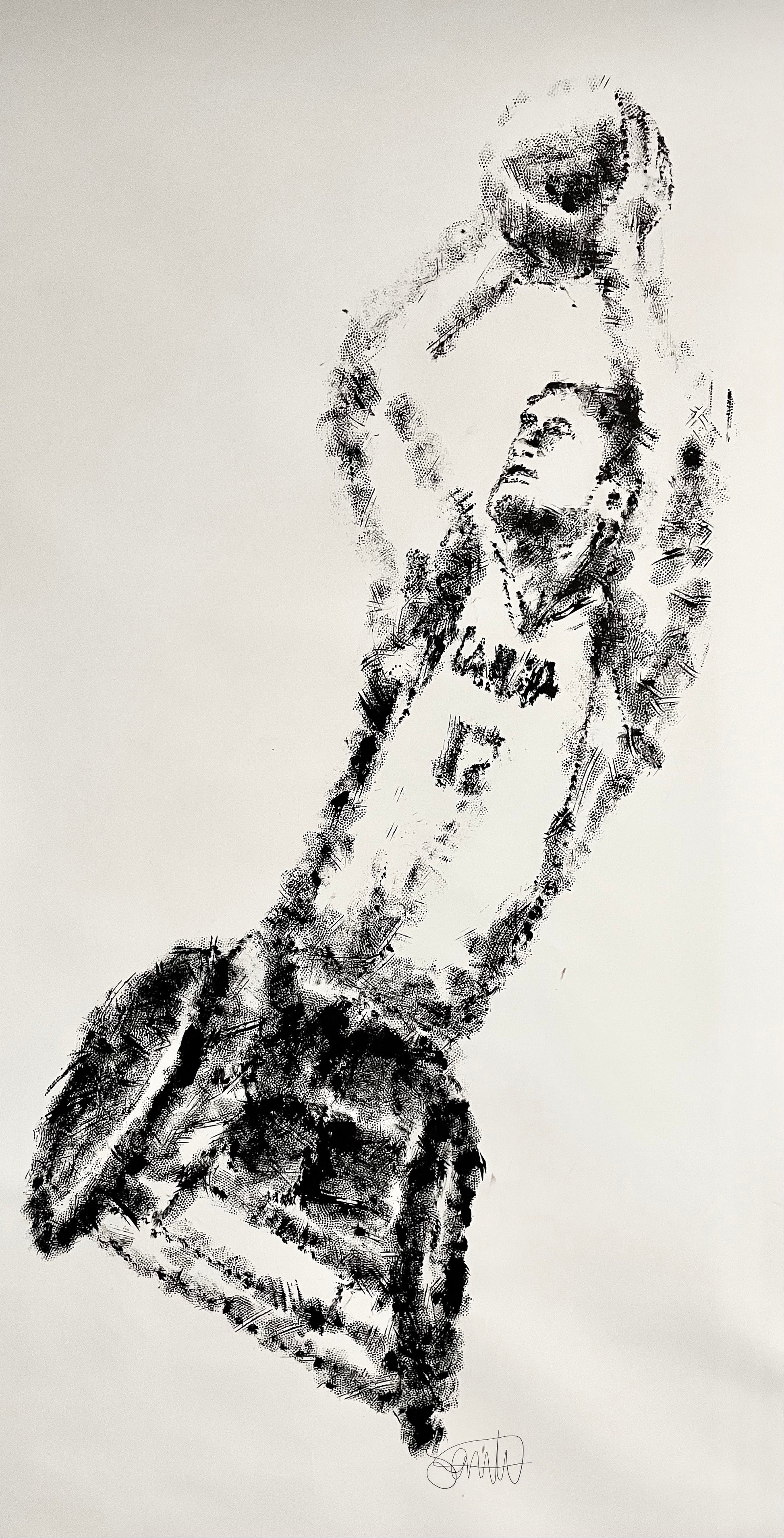 - 28" x 50", peinture acrylique sur papier Fabriano, 2021. Peinture réalisée avec un ballon de basket en guise de pinceau. Un pinceau a été utilisé pour définir davantage les marques faites par le ballon de basket.