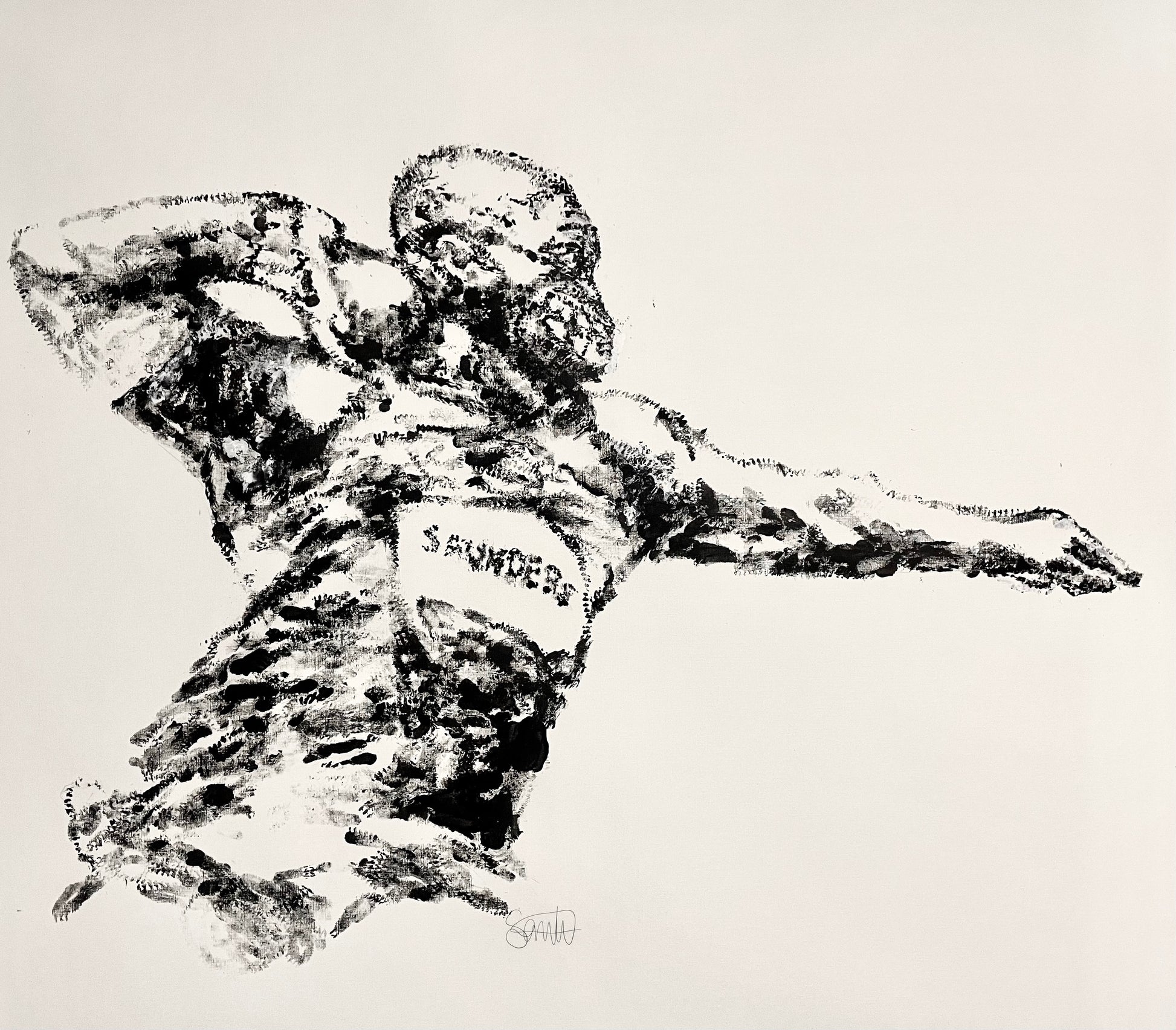 - 40" x 34", peinture acrylique sur papier Canson Canva. La peinture a été réalisée avec une balle de baseball comme pinceau. Un pinceau a été utilisé pour mettre davantage en évidence les marques faites avec la balle de baseball.