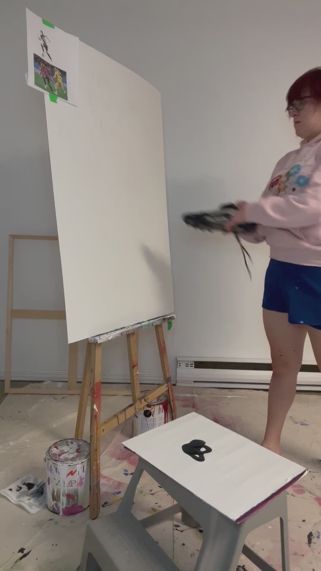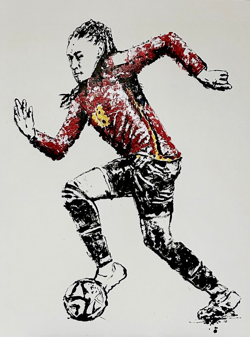 - 30" x 40". Peinture acrylique sur carton, août 2023. Peinture réalisée avec un ballon de football et une chaussure en guise de pinceau. Un pinceau a été utilisé pour mieux définir les marques faites par l'équipement de soccer.
