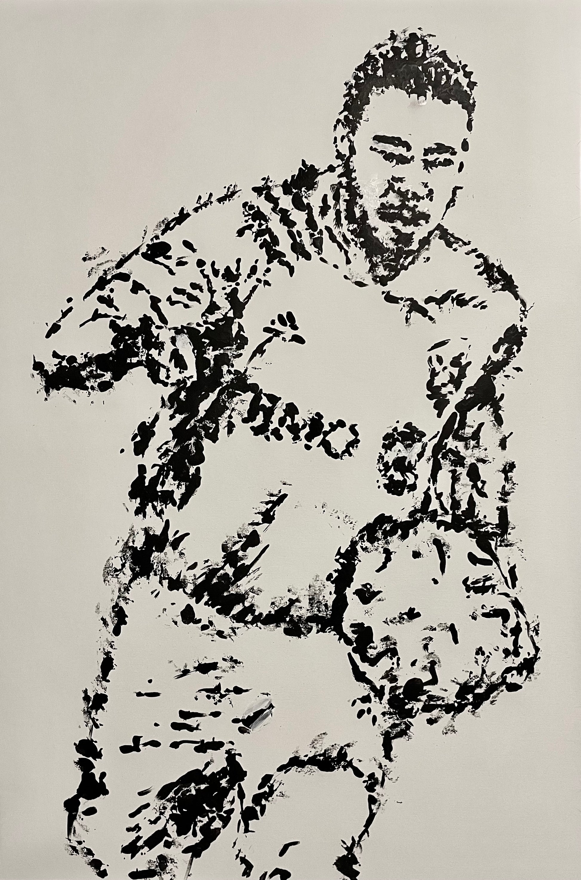 - 24" x 36", peinture acrylique sur papier Canva, 2022. Peinture réalisée avec un ballon de soccer comme pinceau. Un pinceau a été utilisé pour définir davantage les marques faites par un ballon de soccer.