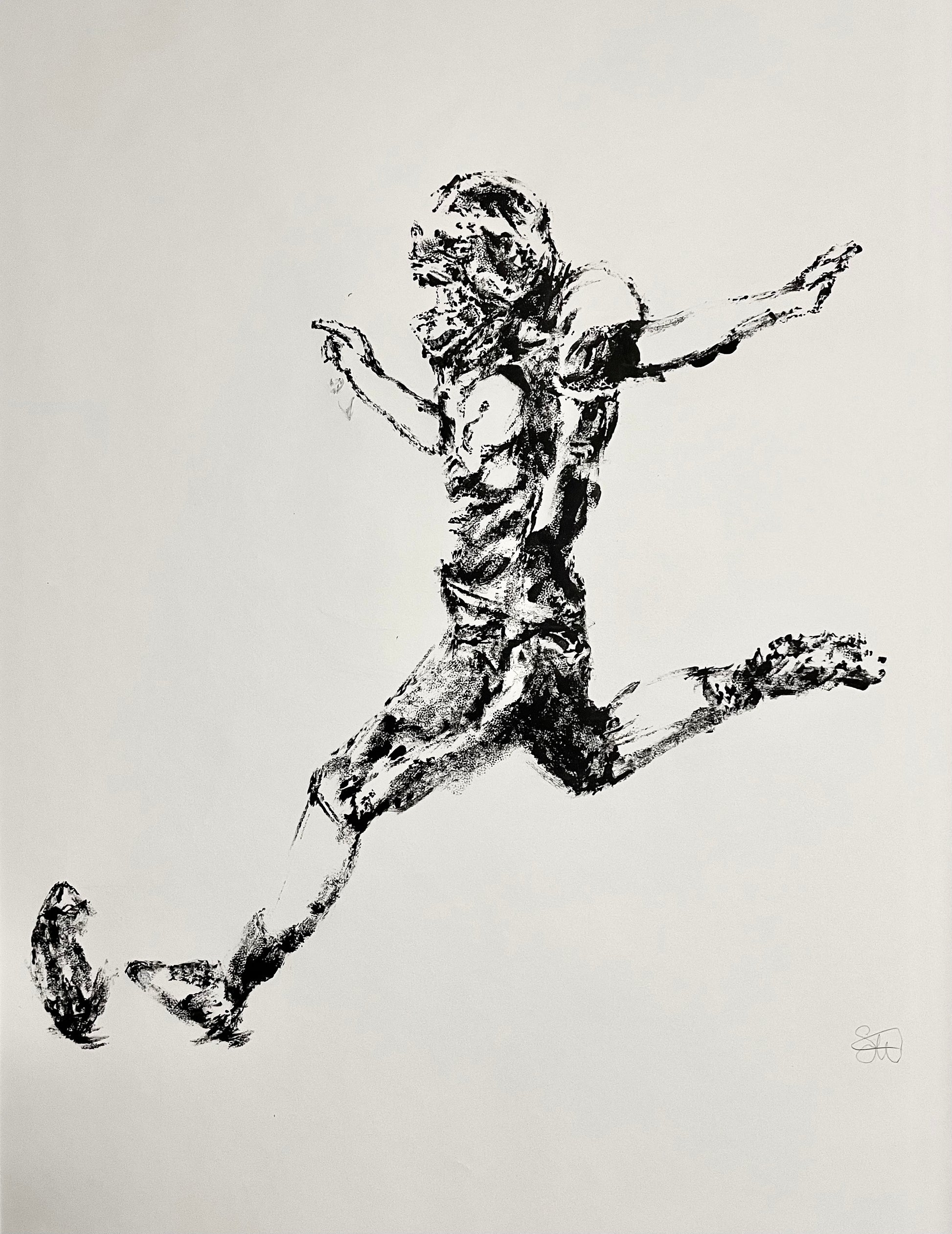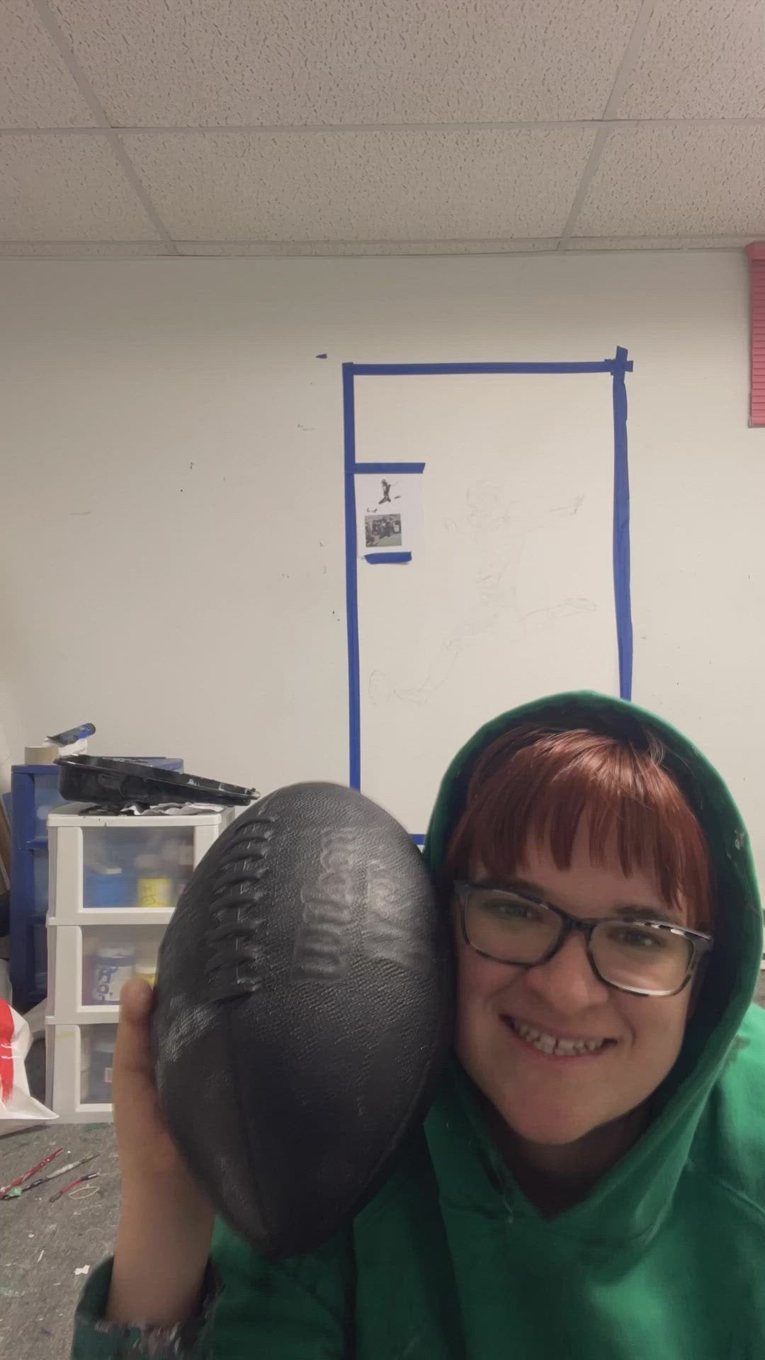 - 32" x 36", acrylic paint on Fabriano paper. Painted with a football as a paintbrush. A paintbrush was used to highlight the marks made by the football.