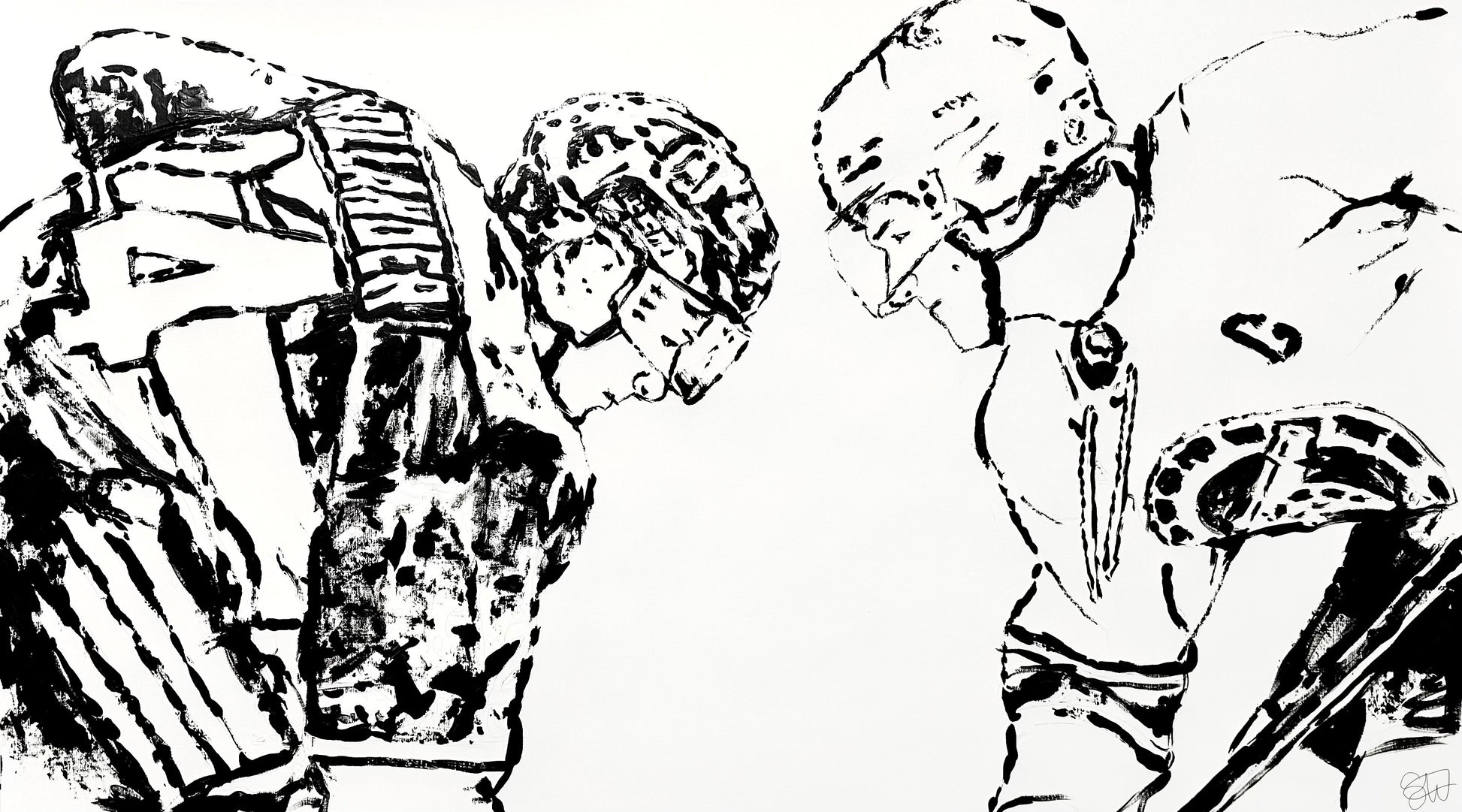 20" x 36", acrylic paint on canva paper. Painting Connor Storrie as Ilya and Hudson Williams as Shane with hockey equipment as a paintbrush. A paintbrush was used to further define the marks made by the hockey equipment.