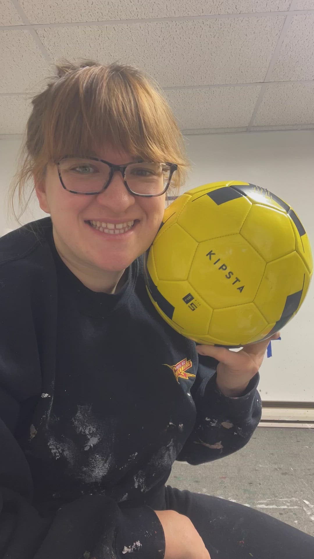- 42" x 36", acrylic paint on Canson Canva paper, 2021. Painting made with a soccer ball as a paintbrush. A paintbrush was used to further highlight the marks made by the soccer ball.