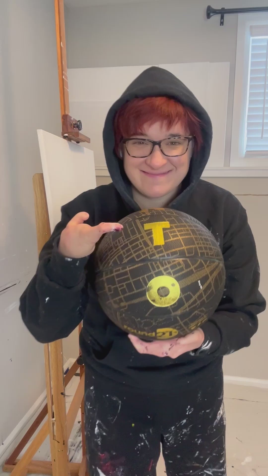 Print of painting made with a basketball paintbrush.