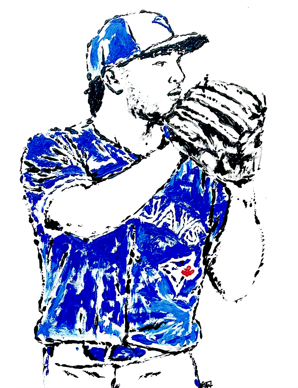 24" x 30" acrylic paint on canvas. Painting made using a baseball glove and ball as a paintbrush. A paintbrush was used to further define the marks made by the baseball equipment.