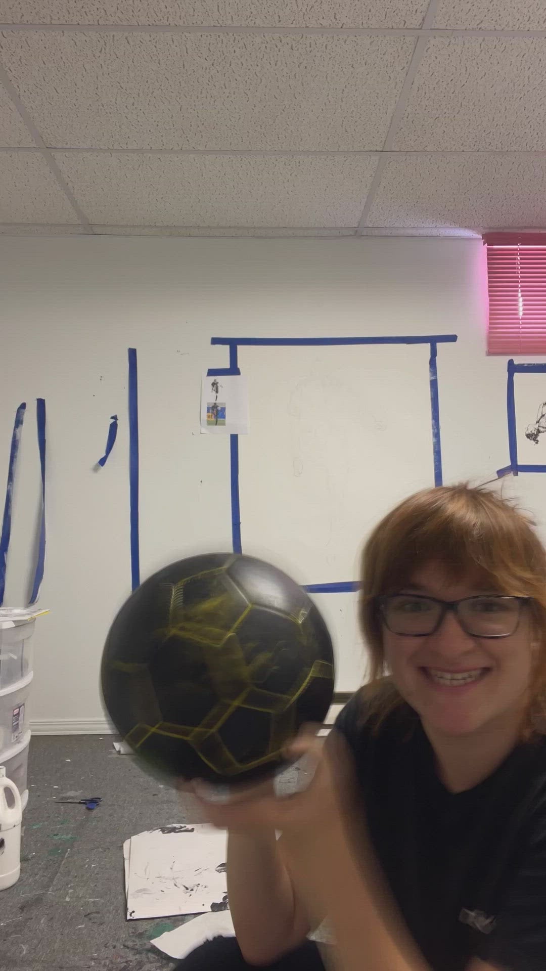 - 30" x 44", acrylic paint on Canson Canva paper, 2021. Painting made with a soccer ball as a paintbrush. A paintbrush was use to further define the marks made by a soccer ball.