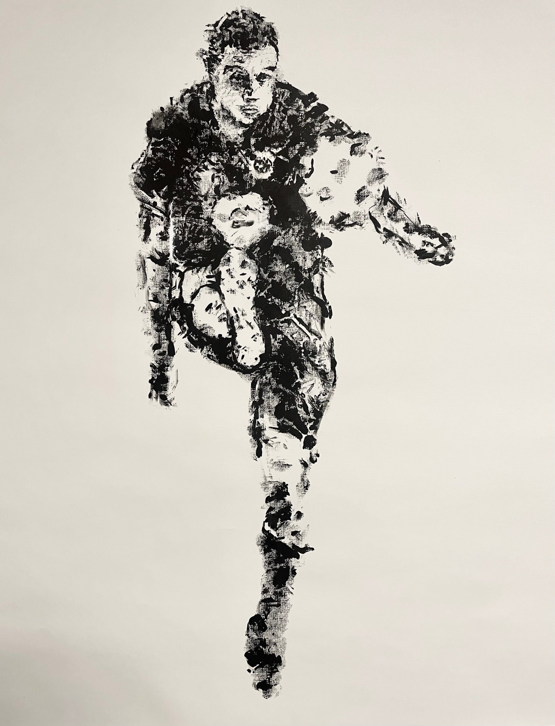 - 30" x 44", peinture acrylique sur papier Canson Canva, 2021. Peinture réalisée avec un ballon de football comme pinceau. Un pinceau a été utilisé pour définir davantage les marques faites par un ballon de football.
